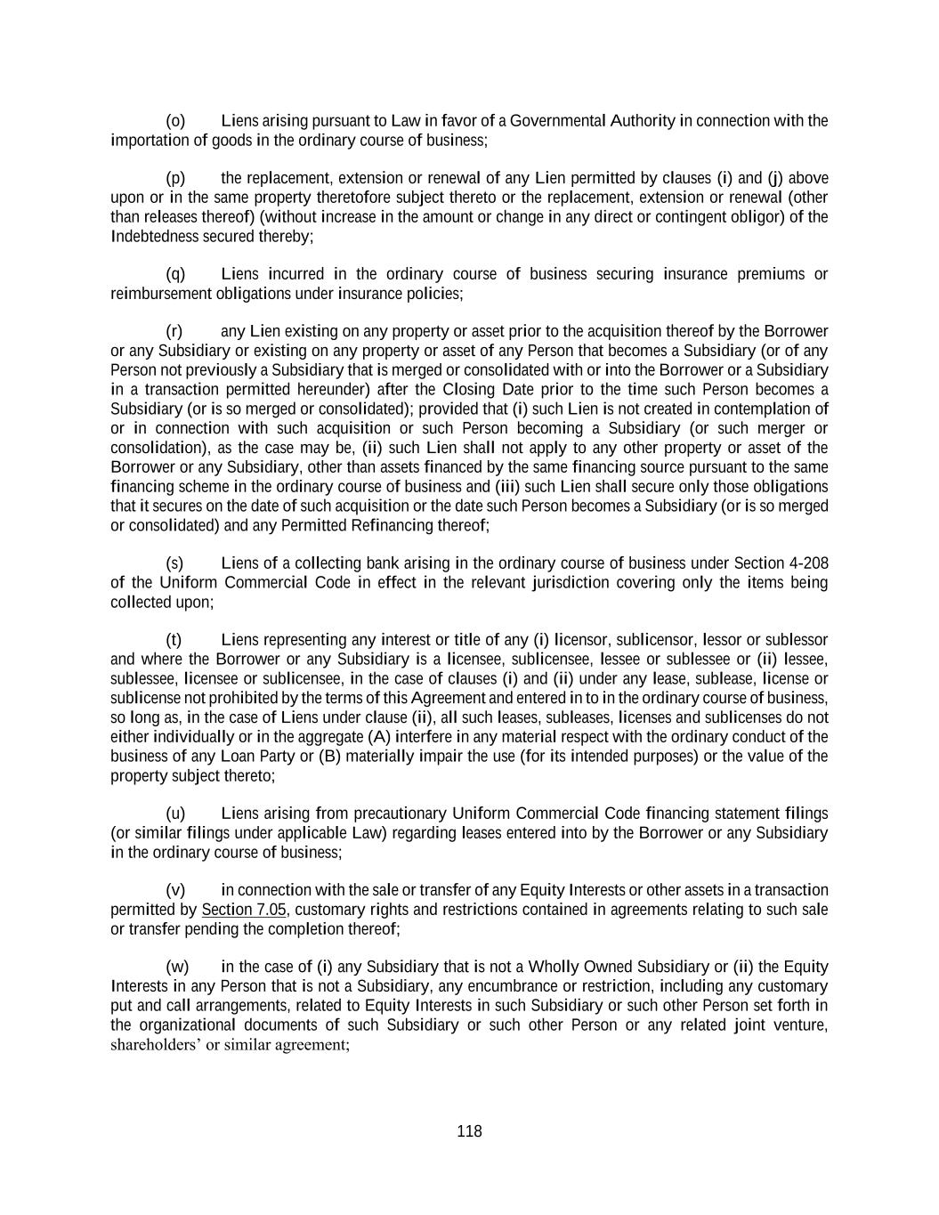 118(o)与正常经营过程中的货物进口有关的依据法律产生的有利于政府当局的留置权;(p)上述(i)和(j)条所允许的任何留置权在受其约束的同一财产上或在其上的任何留置权的替换、延长或续期,由其担保的债务的延期或展期(解除债务除外)(不增加任何直接或或有义务人的金额或发生变化);(q)在为保险费或保险单项下的偿付义务提供担保的正常业务过程中产生的留置权;(r)借款人或任何附属公司在取得任何财产或资产之前存在的任何留置权,或在成为附属公司的任何人(或任何以前不是附属公司的人)的任何财产或资产上存在的任何留置权在借款人或附属公司成为附属公司(或如此合并或合并)之前的截止日期后与借款人或附属公司合并或合并);但(i)该等留置权并非在考虑或与该等收购或该人成为附属公司(或该等合并或合并)(视属何情况而定)有关时设定,(ii)该等留置权不适用于借款人或任何附属公司的任何其他财产或资产,在正常业务过程中由同一融资来源根据同一融资计划融资的资产除外,且(iii)该留置权应仅为该等债务提供担保其在此类收购之日或该人成为子公司(或如此合并或合并)之日担保及其任何许可的再融资;(s)在相关司法管辖区有效的《统一商法典》第4-208条规定的正常业务过程中产生的收款银行的留置权,仅涵盖所收取的物品;(t)代表任何(i)许可人、分许可人、出租人或分出租人的任何权益或所有权的留置权,且借款人或任何子公司是被许可人、分许可人、承租人或分承租人,或(ii)承租人、分承租人、被许可人或分许可人,就本协议条款不加禁止并在正常业务过程中订立的任何租赁、转租、许可或分许可项下的第(i)及(ii)条而言,只要就第(ii)条下的留置权而言,所有该等租赁、转租,许可证分许可不单独或合计(a)干预任何贷款方正常经营业务的任何重大方面,或(b)对受其约束的财产的使用(为其预期目的)或价值造成重大损害;(u)就借款人或任何子公司在正常经营过程中订立的租赁进行的预防性统一商法典融资报表备案(或适用法律下的类似备案)产生的留置权;(v)与任何股权的出售或转让有关或第7.05条允许的交易中的其他资产、与此类出售或转让有关的协议中所载的习惯权利和限制,以待其完成;(w)就(i)任何并非全资附属公司的附属公司或(ii)任何非附属公司的人的股权而言,与该附属公司或该附属公司或该其他人的组织文件或任何相关合资企业、股东或类似协议中所载的该其他人的股权有关的任何产权负担或限制,包括任何习惯上的看跌和看涨安排;