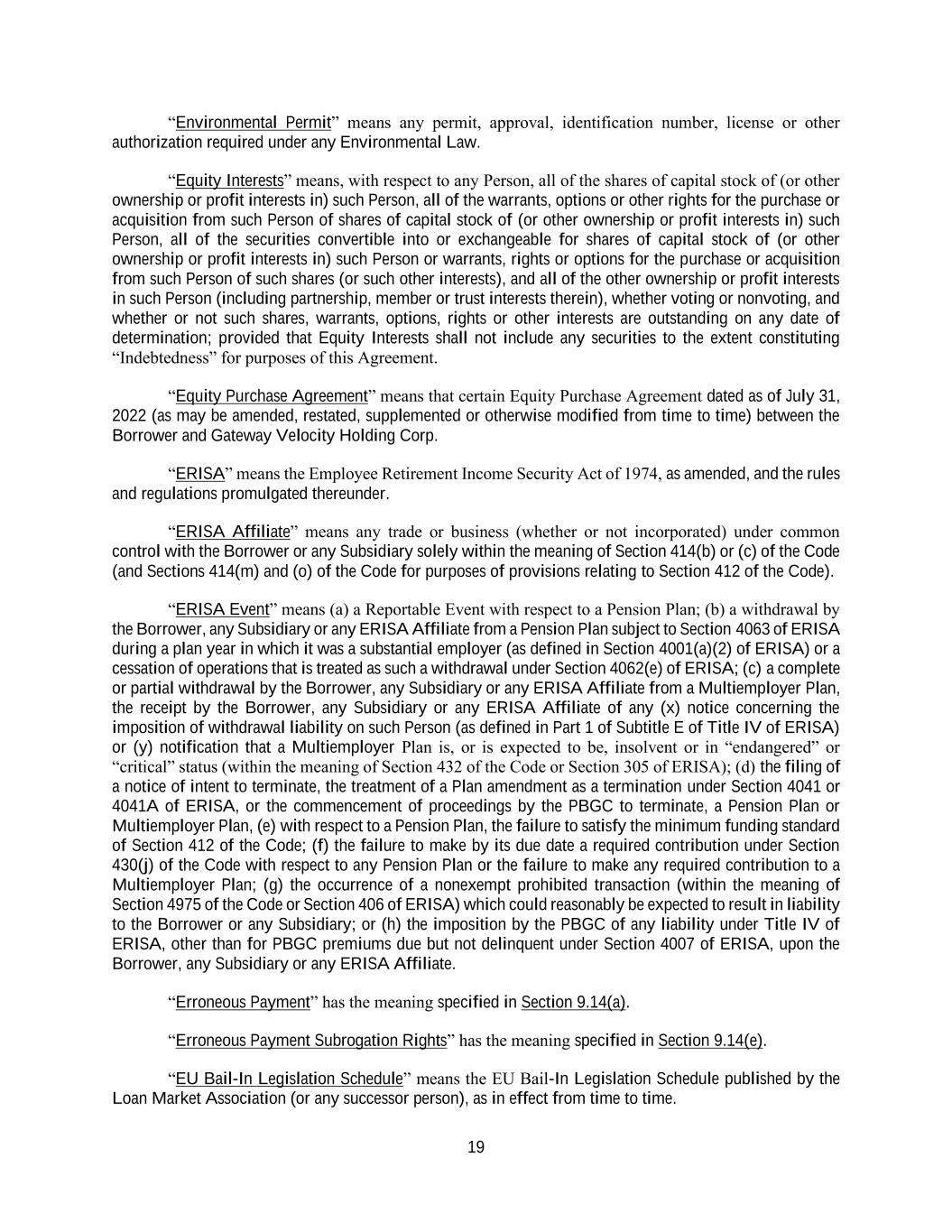 19“环境许可”是指任何环境法规定的任何许可、批准、识别号、许可证或其他授权。“股权权益”是指,就任何人而言,该人的全部股本股份(或其其他所有权或利润权益)、向该人购买或取得该人的股本股份(或其其他所有权或利润权益)的所有认股权证、期权或其他权利、所有可转换为或可交换为该人的股本股份(或其其他所有权或利润权益)的证券或认股权证,向该人士购买或收购该等股份(或该等其他权益)的权利或选择权,以及该人士的所有其他所有权或盈利权益(包括其中的合伙企业、成员或信托权益),不论是否有投票权,以及该等股份、认股权证、期权、权利或其他权益在任何确定日期是否尚未行使;但股权不应包括构成本协议所指“债务”的任何证券。“股权购买协议”是指借款人与Gateway Velocity Holding Corp.之间日期为2022年7月31日的某些股权购买协议(可能不时修订、重述、补充或以其他方式修改)。“ERISA”是指经修订的1974年《雇员退休收入保障法》及其下颁布的规则和条例。“ERISA关联公司”是指仅在《守则》第414(b)或(c)条(以及《守则》第414(m)和(o)条的含义内)与借款人或任何子公司在共同控制下的任何贸易或业务(无论是否成立)(就与《守则》第412条有关的规定而言)。“ERISA事件”是指(a)与养老金计划有关的可报告事件;(b)借款人、任何子公司或任何ERISA关联公司在其作为主要雇主(定义见ERISA第4001(a)(2)节)的计划年度内退出受ERISA第4063条约束的养老金计划,或根据ERISA第4062(e)节被视为此类退出的停止运营;(c)借款人、任何子公司或任何ERISA关联公司完全或部分退出多雇主计划,借款人收到,任何子公司或任何ERISA关联公司收到任何(x)份通知,内容涉及对该人施加退出责任(定义见ERISA标题IV副标题E第1部分)或(y)通知多雇主计划已或预计将资不抵债或处于“濒危”或“危急”状态(在《守则》第432条或ERISA第305节的含义内);(d)提交终止意向通知,根据ERISA第4041或4041A条将计划修订视为终止,或PBGC启动程序终止养老金计划或多雇主计划,(e)就养老金计划而言,未能满足《守则》第412条的最低筹资标准;(f)未能在到期日前就任何养老金计划作出《守则》第430(j)条规定的缴款或未能向多雇主计划作出任何规定的缴款;(g)发生可合理预期会导致对借款人或任何子公司承担责任的非豁免禁止交易(在《守则》第4975节或ERISA第406节的含义内);或(h)PBGC对借款人、任何子公司或任何ERISA关联公司施加ERISA第四章下的任何责任,但根据ERISA第4007节到期但未拖欠的PBGC溢价除外。“错误付款”具有第9.14(a)节规定的含义。“错误付款代位权”具有第9.14(e)节规定的含义。“欧盟纾困立法时间表”是指由贷款市场协会(或任何继任者)公布的欧盟纾困立法时间表,不时生效。