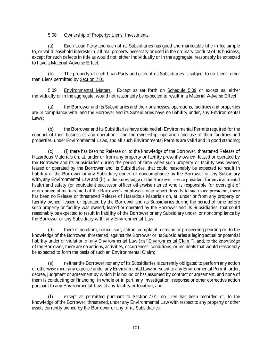1015.08财产所有权;留置权;投资。(a)每一贷款方及其每一附属公司对其正常经营业务所必需或使用的所有不动产拥有费用简单的良好和可销售的所有权,或有效的租赁权益,但所有权上的缺陷除外,这些缺陷无论是单独的还是合计的,都合理地预计不会产生重大不利影响。(b)除第7.01条准许的留置权外,每一贷款方及其每一附属公司的财产均不受留置权规限。5.09环境事项。除附表5.09所列的情况外,或除非个别地或合计地合理预期不会导致重大不利影响:(a)借款人及其附属公司及其业务、经营、设施和财产符合任何环境法,且借款人及其附属公司根据任何环境法不承担任何责任;(b)借款人及其附属公司已根据环境法获得开展其业务和经营以及其设施和财产的所有权、经营和使用所需的所有环境许可,(c)(i)在借款人及其子公司拥有、租赁或经营此类财产或设施期间,借款人及其子公司目前拥有、租赁或经营的任何财产或设施上、在其下、在其下或在其下没有释放或据借款人所知威胁释放危险材料,这可以合理地预期会导致借款人或任何子公司根据以下规定承担责任,或借款人或任何子公司不遵守,任何环境法和(ii)据借款人负责环境健康和安全的副总裁(或以其他方式指定负责监督环境事项的同等继任官员)和直接向该副总裁报告的借款人雇员所知,在借款人及其子公司拥有、租赁或经营的任何财产或设施上、在其下、或从该财产或设施上或从该财产或设施上释放或威胁释放危险材料,在借款人及其子公司拥有、租赁或经营该财产或设施之前的一段时间内,可合理预期会导致借款人或任何附属公司根据任何环境法承担责任,或借款人或任何附属公司不遵守任何环境法;(d)没有针对借款人或其附属公司声称根据或违反任何环境法承担实际或潜在责任的索赔、通知、诉讼、诉讼、投诉、要求或程序待决或据借款人所知受到威胁(“环境索赔”),并且据借款人所知,没有任何行动、活动、事件、条件,或合理预期会构成此类环境索赔基础的事件;(e)借款人或其任何子公司目前均无义务根据其受其约束或已通过合同或协议承担的任何环境许可、命令、法令、判决或协议根据任何环境法采取任何行动或以其他方式产生任何费用,且他们均未进行或资助全部或部分任何调查,在任何设施或地点根据任何环境法作出回应或采取其他纠正行动;(f)除根据第7.01条许可外,没有记录任何留置权,或据借款人所知,根据任何环境法,没有威胁到借款人或其任何子公司目前拥有的任何财产或其他资产。
