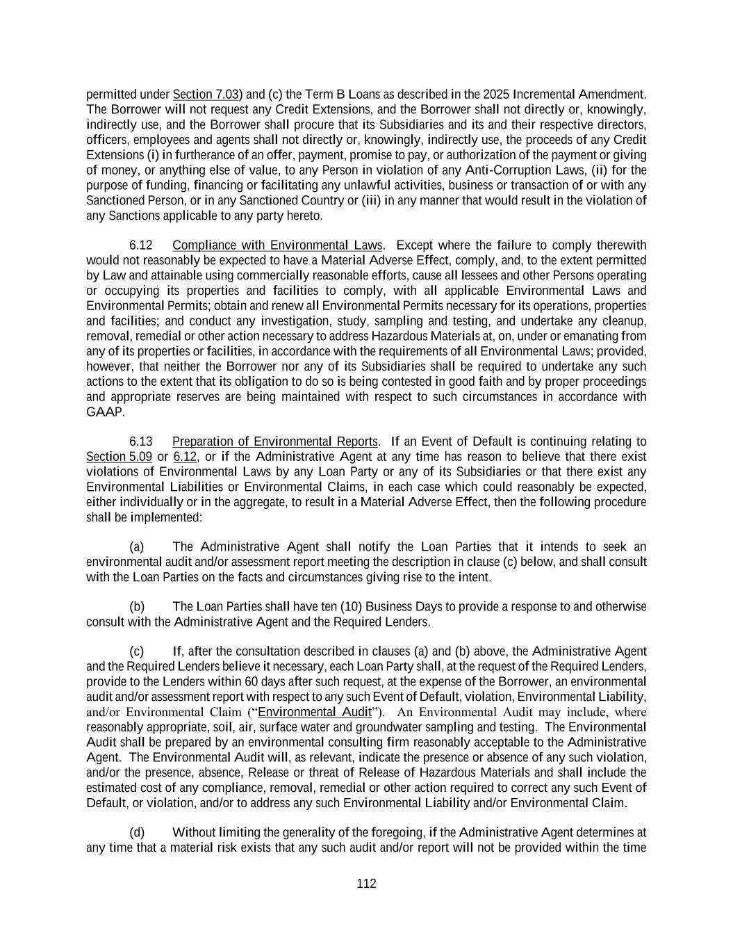 112根据第7.03条允许)和(c)2025年增量修正案中所述的定期B贷款。借款人不会要求任何信贷展期,借款人不得直接或在知情的情况下间接使用,且借款人应促使其子公司及其各自的董事、高级职员、雇员和代理人不得直接或在知情的情况下间接使用任何信贷展期的收益(i)促进向任何人违反任何反腐败法律的要约、付款、承诺付款或授权付款或给予金钱或任何其他有价值的东西,(ii)为资助、资助或便利任何非法活动的目的,与任何受制裁人员或与其进行的业务或交易,或在任何受制裁国家或(iii)以任何方式导致违反适用于本协议任何一方的任何制裁。6.12遵守环境法。除非未能遵守这些规定不会被合理地预期会产生重大不利影响,否则遵守并在法律允许且可通过商业上合理的努力实现的范围内,促使所有承租人和其他经营或占用其财产和设施的人遵守所有适用的环境法和环境许可;获得并更新其经营、财产和设施所需的所有环境许可;进行任何调查、研究、取样和测试,并采取任何必要的清理、清除、补救或其他行动,以在、、根据或源自其任何财产或设施,按照所有环境法的要求;但前提是,借款人或其任何子公司均无需采取任何此类行动,前提是其这样做的义务受到善意的质疑,并通过适当的程序和根据公认会计原则就此类情况维持适当的准备金。6.13编制环境报告。如果与第5.09或6.12节有关的违约事件仍在继续,或者如果行政代理人在任何时候有理由相信任何贷款方或其任何子公司存在违反环境法的行为,或存在任何环境责任或环境索赔,在每种情况下,可以合理地预期,无论是单独的还是总体的,都会导致重大不利影响,则应执行以下程序:(a)行政代理人应通知贷款方,其打算寻求符合下文(c)款描述的环境审计和/或评估报告,并应就产生该意图的事实和情况与贷款方协商。(b)贷款方应有十(10)个工作日向行政代理人和所需贷款人提供答复或以其他方式进行协商。(c)如经上述(a)及(b)条所述谘询后,行政代理人及规定贷款人认为有需要,每一贷款方须应规定贷款人的要求,在该要求后60天内向贷款人提供有关任何该等违约、违规、环境责任和/或环境索赔事件的环境审计和/或评估报告(“环境审计”),费用由借款人承担。环境审计可在合理适当时包括土壤、空气、地表水和地下水采样和检测。环境审计由行政代理人合理接受的环境咨询事务所编制。环境审计将酌情表明存在或不存在任何此类违规行为,和/或存在、不存在、释放或威胁释放危险材料,并应包括为纠正任何此类违约或违规事件和/或解决任何此类环境责任和/或环境索赔所需的任何合规、清除、补救或其他行动的估计成本。(d)在不限制前述一般性的情况下,如果行政代理人在任何时候确定存在重大风险,在该时间内不提供任何此类审计和/或报告
