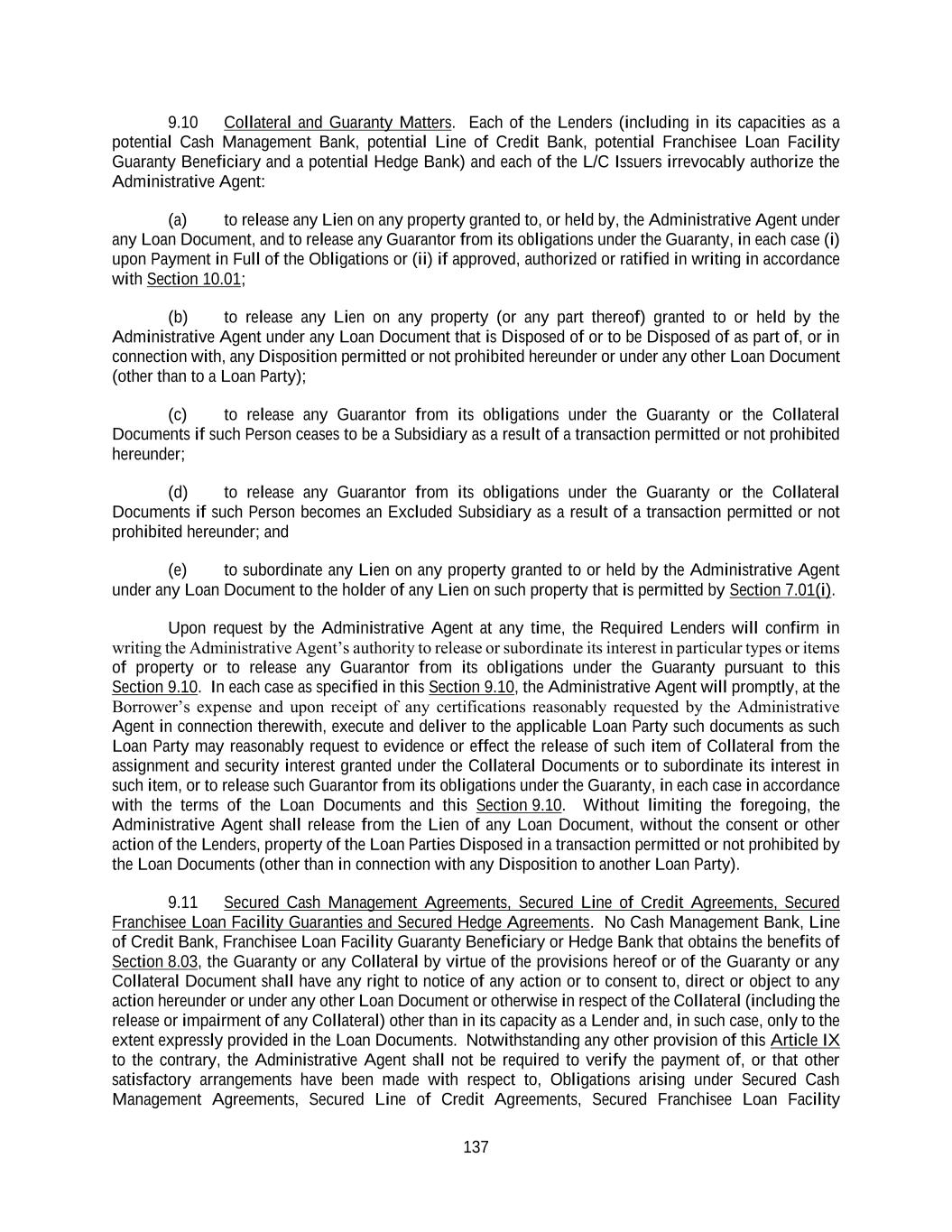 1379.10抵押和担保事项。各贷款人(包括以其作为潜在现金管理银行、潜在信用额度银行、潜在特许经营人贷款融资担保受益人和潜在对冲银行的身份)和各信用证发行人不可撤销地授权行政代理人:(a)解除根据任何贷款文件授予或由行政代理人持有的任何财产的任何留置权,并解除任何担保人在担保项下的义务,在每种情况下(i)在全额支付义务时或(ii)如果获得批准,根据第10.01条以书面授权或批准;(b)解除行政代理人根据任何贷款文件批给或持有的任何财产(或其任何部分)上的任何留置权,而该等财产(或其任何部分)已被处置或将被处置,或与此有关,根据本协议或任何其他贷款文件(贷款方除外)允许或未禁止的任何处置;(c)解除任何担保人在担保或抵押文件项下的义务,如果该人因本协议允许或未禁止的交易而不再是子公司;(d)解除任何担保人在担保或抵押文件项下的义务(e)将行政代理人根据任何贷款文件批给或持有的任何财产上的任何留置权,附属于第7.01(i)条准许的该等财产上的任何留置权的持有人,如该等人因根据本协议准许或未予禁止的交易而成为被排除的附属公司;及(e)将该等财产上的任何留置权附属于该等财产上的任何留置权的持有人。经行政代理人随时提出要求,所需贷款人将以书面确认行政代理人根据本条第9.10款解除其在特定类别或财产项目上的权益或解除任何担保人在担保项下的义务的权力。在本条第9.10款规定的每一种情况下,行政代理人在借款人负担费用并收到行政代理人合理要求的与此有关的任何证明后,将迅速签署并向适用的贷款方交付该贷款方合理要求的文件,以作为证据或实现解除该担保物项下根据担保单证授予的转让和担保权益或将其在该担保物上的权益置于次要地位,或解除该担保人在担保项下的义务,在每种情况下均按照贷款文件的条款和本第9.10节。在不限制前述规定的情况下,行政代理人应当解除任何贷款文件的留置权,不经出借人同意或采取其他行动,解除在贷款文件允许或不禁止的交易中处分的贷款方的财产(与对另一贷款方的任何处分有关的除外)。9.11有担保的现金管理协议、有担保的信贷额度协议、有担保的特许经营商贷款融资担保和有担保的对冲协议。任何现金管理银行、信用额度银行、特许经营人贷款融资担保受益人或对冲银行如因本协议的规定或担保或任何抵押文件而获得第8.03条、担保或任何抵押品的利益,除以贷款人身份外,均无权通知任何行动或同意、指示或反对根据本协议或任何其他贷款文件或以其他方式就抵押品采取的任何行动(包括任何抵押品的解除或减值),在这种情况下,仅限于贷款文件中明确规定的范围。尽管本条第九条另有相反规定,不得要求行政代理人核实有担保现金管理协议、有担保信贷额度协议、有担保加盟商贷款融资项下产生的债务的支付情况,或已就其作出其他令人满意的安排