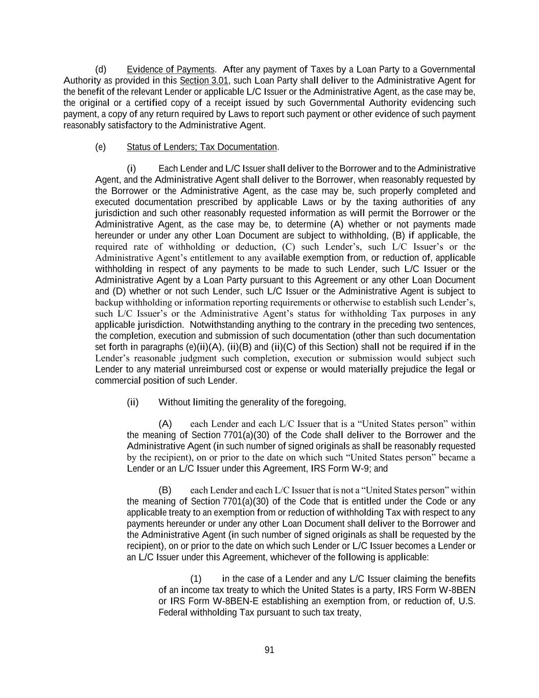 91(d)付款证据。贷款方按本条3.01的规定向政府机关缴纳税款后,该贷款方应为相关贷款人或适用的信用证发行人或行政代理人(视情况而定)的利益向行政代理人交付该政府机关出具的证明该付款的收据的原件或核证副本、法律要求的报告该付款的任何申报表的副本或行政代理人合理满意的该付款的其他证据。(e)贷款人的地位;税务文件。(i)各贷款人及信用证发行人须向借款人及行政代理人交付,而行政代理人在借款人或行政代理人(视属何情况而定)合理要求时,须向借款人交付适用法律或任何司法管辖区的税务机关订明的妥善填写及签立的文件,以及允许借款人或行政代理人(视属何情况而定)确定(a)根据本协议或根据任何其他贷款文件支付的款项是否须予扣留的其他合理要求的资料,(b)如适用,规定的预扣或扣除比率,(c)该等贷款人、该等信用证发行人或行政代理人有权就贷款方根据本协议或任何其他贷款文件向该等贷款人、该等信用证发行人或该行政代理人支付的任何款项获得任何可用的豁免或减少适用的预扣,以及(d)不论该贷款人、该信用证发行人或该行政代理人是否须遵守备用预扣或信息报告要求或以其他方式确立该贷款人的,该等信用证发行人或行政代理人在任何适用法域的预扣税地位。尽管前两句中有任何相反的规定,如果在贷款人的合理判断中,完成、执行或提交此种文件(本节(e)(二)(a)、(二)(b)和(二)(c)段所述的此种文件除外)将使该贷款人承担任何重大的未偿还的成本或费用,或将对该贷款人的法律或商业地位造成重大损害,则不需要完成、执行和提交此种文件。(ii)在不限制前述一般性的情况下,(a)每名贷款人和每名属于《守则》第7701(a)(30)条所指的“美国人”的信用证发行人,应在该“美国人”根据本协议成为贷款人或信用证发行人之日或之前,向借款人和行政代理人(按收件人合理要求的签名正本的数量)交付,IRS表格W-9;及(b)根据《守则》或任何适用条约有权就根据本协议或根据任何其他贷款文件支付的任何款项获得预扣税豁免或减免的每一贷款人及并非《守则》第7701(a)(30)条所指的“美国人”的每一信用证发行人,应向借款人和行政代理人交付(以收件人要求的签名正本的数量为准),在该贷款人或信用证发行人根据本协议成为贷款人或信用证发行人之日或之前,以下任一情况均适用:(1)在贷款人和任何信用证发行人主张美国作为缔约方的所得税条约的利益的情况下,IRS表格W-8BEN或IRS表格W-8BEN-E确立根据该税收条约豁免或减少美国联邦预扣税,