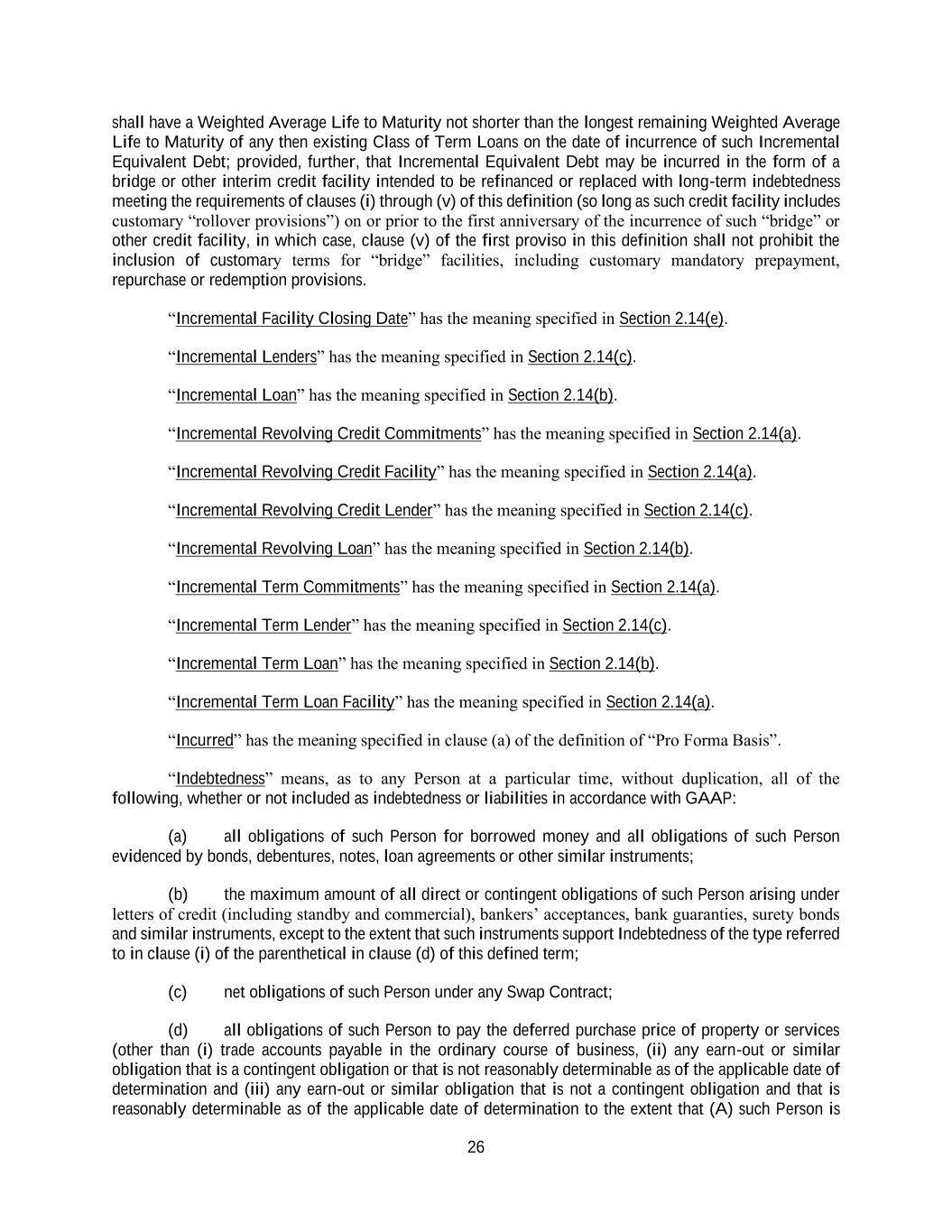 26日的加权平均到期期限不短于任何当时存在的类别定期贷款在该等增量等值债务发生之日的最长剩余加权平均到期期限;此外,在该“过桥”或其他信贷便利发生一周年当日或之前,可能以旨在再融资的过桥或其他临时信贷便利的形式发生增量等值债务,或以符合本定义第(i)至(v)条要求的长期债务(只要该信贷便利包括惯常的“展期条款”)取代,在这种情况下,本定义中第一个但书的(v)条不应禁止列入“过桥”便利的惯常用语,包括惯常的强制性提前还款、回购或赎回条款。“增量融资关闭日期”具有第2.14(e)节规定的含义。“增量放款人”具有第2.14(c)节规定的含义。“增量贷款”具有第2.14(b)节规定的含义。“增量循环信贷承诺”具有第2.14(a)节规定的含义。“增量循环信贷工具”具有第2.14(a)节规定的含义。“增量循环信贷贷款人”具有第2.14(c)节规定的含义。“增量循环贷款”具有第2.14(b)节规定的含义。“增量期限承诺”具有第2.14(a)节规定的含义。“增量定期贷款人”具有第2.14(c)节规定的含义。“增量定期贷款”具有第2.14(b)节规定的含义。“增量定期贷款工具”具有第2.14(a)节规定的含义。“发生”具有“备考基准”定义(a)条规定的含义。“负债”是指,就特定时间的任何人而言,没有重复的,以下所有,无论是否按照公认会计原则计入债务或负债:(a)该人对所借资金的所有义务以及该人以债券、债权证、票据、贷款协议或其他类似工具为证明的所有义务;(b)该人在信用证(包括备用和商业)、银行承兑汇票、银行担保、担保债券和类似工具下产生的所有直接或或有义务的最高金额,除非该等票据支持本界定条款(d)条括号内第(i)条所述类型的债务;(c)该人在任何掉期合约下的净债务;(d)该人支付财产或服务的递延购买价款的所有义务((不包括(i)在正常业务过程中应付的贸易账款,(ii)属于或有债务或截至适用的确定日期不能合理确定的任何盈利或类似债务,以及(iii)不属于或有债务且截至适用的确定日期可合理确定的任何盈利或类似债务,但以(a)该人是