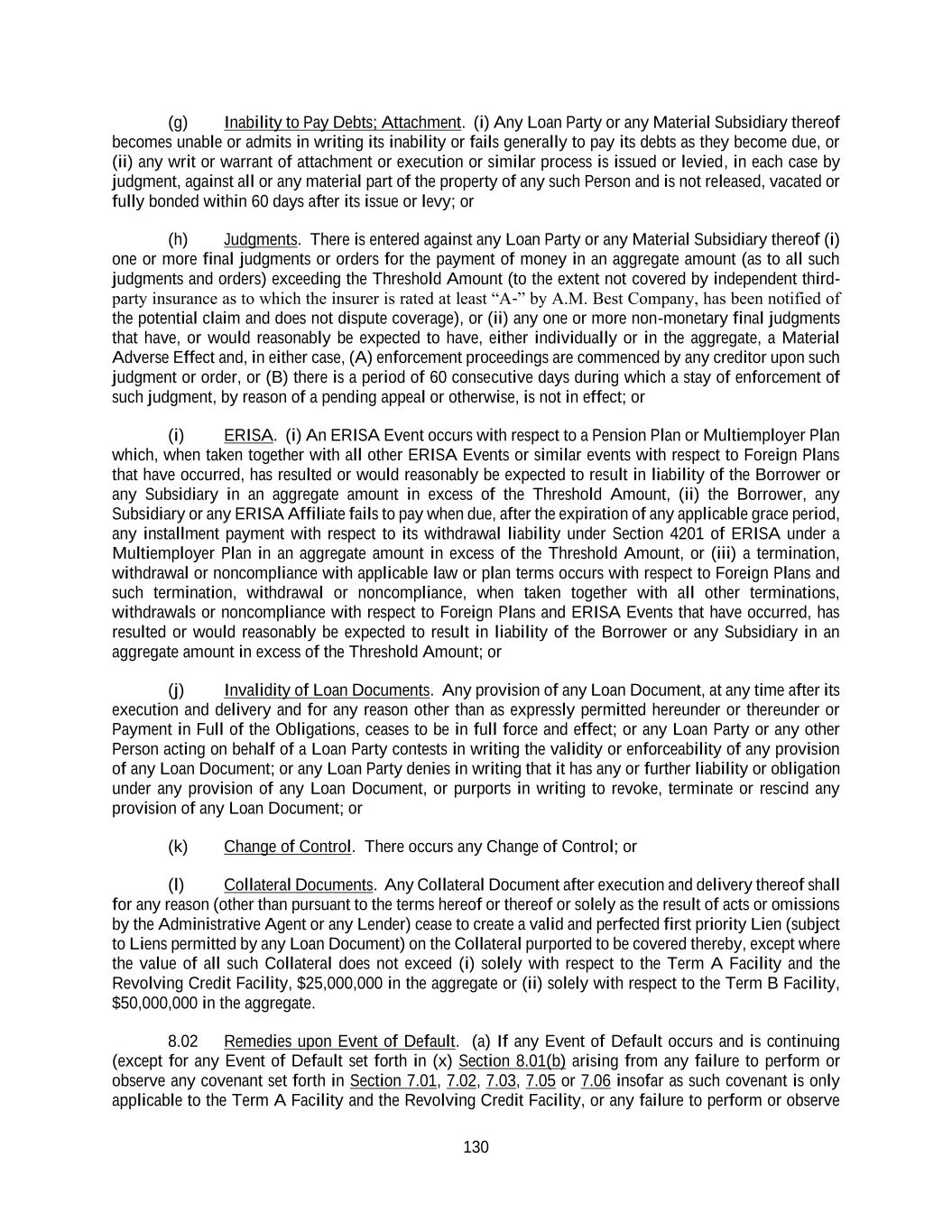130(g)无力偿还债务;附件。(i)任何贷款方或其任何重要附属公司变得无法或以书面承认其无力或一般未能在债务到期时偿付其债务,或(ii)任何扣押令或签立或类似程序的令状或手令(在每宗个案中均以判决方式)针对任何该等人的全部或任何重要部分财产而发出或征收,且在其发出或征收后60天内未获释放、腾空或完全抵押;或(h)判决。针对任何贷款方或其任何重要附属公司订立(i)一项或多项最终判决或命令,要求支付总额(就所有此类判决和命令而言)超过阈值金额(在独立第三方保险未涵盖的范围内,即保险人被A.M. Best Company评为至少“A-”,已被告知潜在索赔且不对承保范围提出争议),或(ii)任何一项或多项非金钱最终判决已经或将合理预期会,单独或合计产生重大不利影响,在任何一种情况下,(a)任何债权人根据该判决或命令启动强制执行程序,或(b)有一段连续60天的期间,在此期间,由于未决上诉或其他原因,暂停执行该判决不生效;或(i)ERISA。(i)与养老金计划或多雇主计划有关的ERISA事件发生,当与已发生的所有其他ERISA事件或与外国计划有关的类似事件一起计算时,已导致或将合理预期导致借款人或任何子公司的负债总额超过阈值金额,(ii)借款人、任何子公司或任何ERISA关联公司在任何适用的宽限期届满后未能在到期时付款,与其根据ERISA第4201条在多雇主计划下的提款责任相关的任何分期付款,其总额超过阈值金额,或(iii)与已发生的与外国计划和ERISA事件相关的所有其他终止、提款或不遵守有关的外国计划和此类终止、提款或不遵守情况一起发生的终止、提款或不遵守情况,已经导致或将合理预期导致借款人或任何子公司的负债总额超过阈值金额;或(j)贷款文件无效。任何贷款文件的任何条文,在其签立及交付后的任何时间,以及由于本协议或本协议项下明示许可或全额支付义务以外的任何理由,均不再具有完全效力及效力;或任何贷款方或代表贷款方行事的任何其他人以书面质疑任何贷款文件的任何条文的有效性或可执行性;或任何贷款方以书面否认其根据任何贷款文件的任何条文承担任何或进一步的责任或义务,或拟以书面撤销、终止或撤销任何贷款文件的任何条文;或(k)控制权变更。发生任何控制权变更;或(l)抵押单证。任何抵押品文件在签立及交付后,须因任何理由(依据本协议或其条款或仅因行政代理人或任何贷款人的作为或不作为而除外)而停止在看来由该抵押品涵盖的抵押品上设定有效及完善的第一优先留置权(受任何贷款文件所允许的留置权规限),但所有该等抵押品的价值仅就期限A融资和循环信贷融资而言不超过(i)的情况除外,总额25000000美元或(二)仅就B期融资而言,总额5000000美元。8.02发生违约时的补救措施。(a)如任何违约事件发生并仍在继续(((x)第8.01(b)条所述的任何违约事件除外,该违约事件是由于未能履行或遵守第7.01、7.02、7.03、7.05或7.06条所列的任何契诺而产生的,只要该契诺仅适用于期限A融资和循环信贷融资,或任何未能履行或遵守
