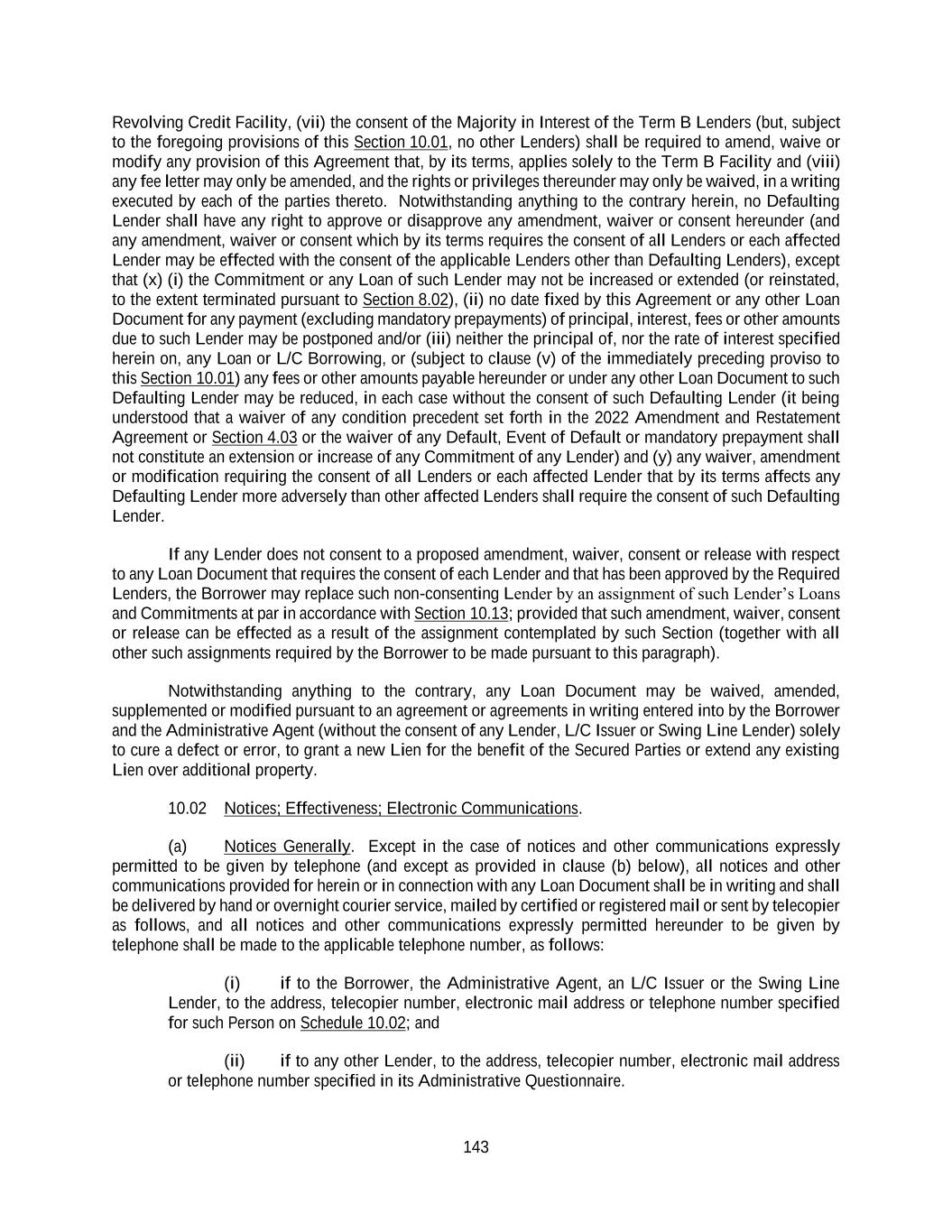 143循环信贷融资,(vii)须经B期贷款人的多数权益同意(但在符合本条第10.01条前述规定的情况下,不得有其他贷款人)修订、放弃或修改本协议中根据其条款仅适用于B期贷款的任何条款,以及(viii)任何收费函件只能以每一方签署的书面形式修订,且只能放弃根据其享有的权利或特权。尽管有任何与此相反的规定,任何违约贷款人均无权批准或不批准根据本协议作出的任何修订、放弃或同意(以及根据其条款需要所有贷款人或每个受影响的贷款人同意的任何修订、放弃或同意,可在违约贷款人以外的适用贷款人同意的情况下进行),但(x)(i)该等贷款人的承诺或任何贷款不得增加或延长(或恢复,但以根据第8.02条终止的范围为限),(ii)本协议或任何其他贷款文件所订定的日期,不得推迟支付(不包括强制性提前还款)应付该贷款人的本金、利息、费用或其他款项,及/或(iii)任何贷款或信用证借款的本金或本协议所指明的利率,或(在符合本条第10.01条紧接前一条但书第(v)款的规定下)根据本协议或根据任何其他贷款文件应付该违约贷款人的任何费用或其他款项,在每种情况下,未经该违约贷款人同意(有一项理解,即放弃2022年修订和重述协议或第4.03节中规定的任何先决条件或放弃任何违约、违约事件或强制提前还款不应构成延长或增加任何贷款人的任何承诺)和(y)任何需要所有贷款人或每个受影响的贷款人同意的放弃、修订或修改,如果其条款对任何违约贷款人的影响比其他受影响的贷款人更不利,则应要求该违约贷款人的同意。如任何贷款人不同意就任何需要每名贷款人同意且已获所需贷款人批准的贷款文件提出的修订、放弃、同意或解除,则借款人可根据第10.13条以平价转让该贷款人的贷款和承诺取代该非同意贷款人;但该等修订、放弃、同意或解除可作为该条所设想的转让的结果(连同借款人根据本款要求作出的所有其他此类转让)。尽管有任何相反的规定,任何贷款文件可根据借款人和行政代理人(未经任何贷款人、信用证发行人或周转线路贷款人同意)订立的一项或多项书面协议而被放弃、修订、补充或修改,仅为纠正缺陷或错误、为有担保当事人的利益授予新的留置权或延长对额外财产的任何现有留置权。10.02通知;生效;电子通信。(a)一般通知。除明确准许以电话发出的通知和其他通信(以及下文(b)款另有规定的除外)外,本协议规定的或与任何贷款文件有关的所有通知和其他通信均应采用书面形式,并应以专人送达或隔夜快递服务方式送达,以挂证或挂号邮件方式邮寄或电传复印机方式发送如下,而本协议明确准许以电话方式发出的所有通知和其他通信,均应按以下方式向适用的电话号码发出:(i)如向借款人、行政代理人、信用证发行人或周转线贷款人,向附表10.02为该人指明的地址、电传复印机号码、电子邮件地址或电话号码;及(ii)如向任何其他贷款人,则向其行政问卷所指明的地址、电传复印机号码、电子邮件地址或电话号码。