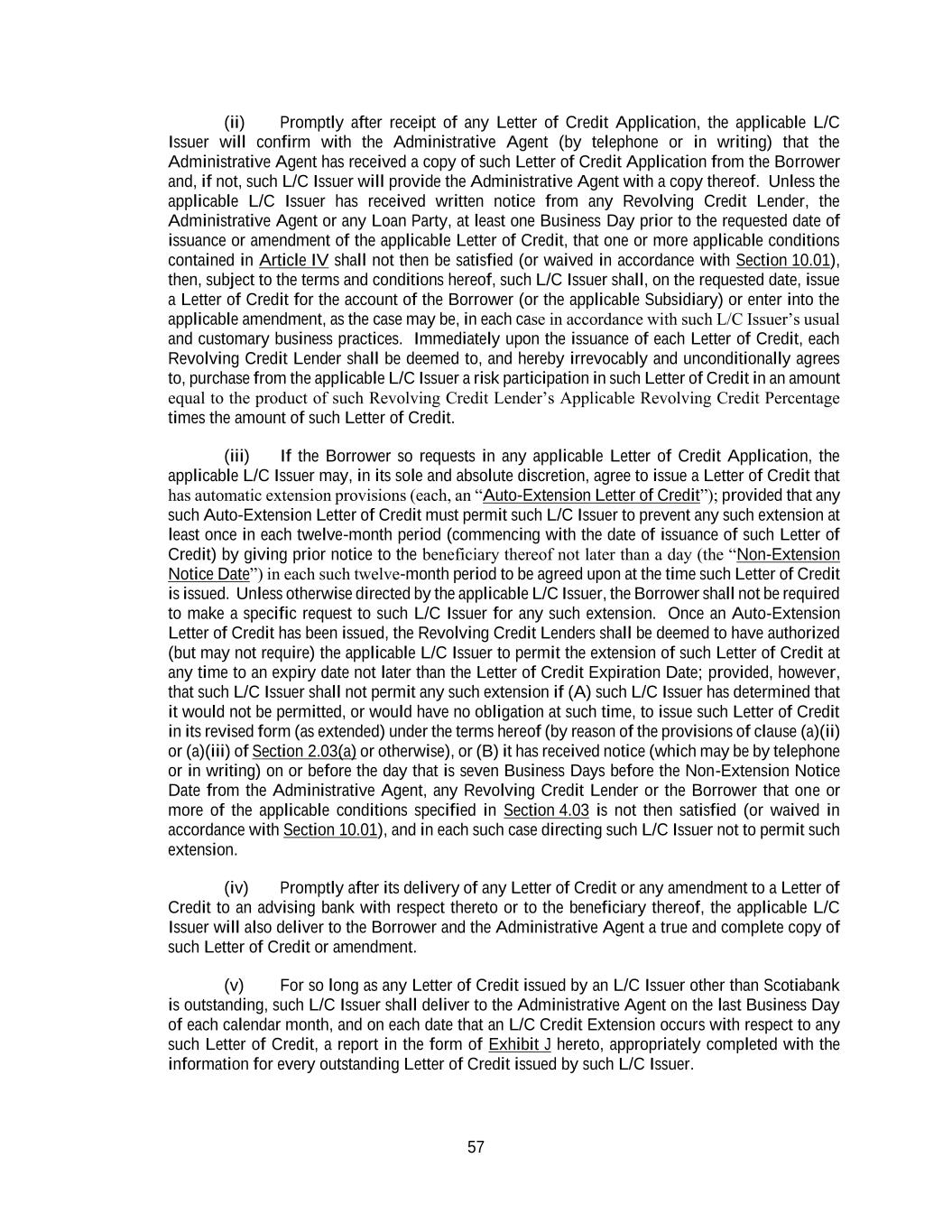 57(ii)在收到任何信用证申请后,适用的信用证发行人将迅速与行政代理人确认(通过电话或书面方式),该行政代理人已从借款人收到该信用证申请的副本,如未收到,该信用证发行人将向该行政代理人提供其副本。除非适用的信用证发行人已收到任何循环信贷贷款人、行政代理人或任何贷款方的书面通知,至少在所要求的适用信用证签发或修改日期前一个营业日,即第四条所载的一项或多项适用条件随后将不会得到满足(或根据第10.01条被放弃),则在符合本协议条款和条件的情况下,该信用证发行人应在所要求的日期,为借款人(或适用的附属公司)的账户签发信用证或订立适用的修订(视情况而定),在每种情况下均按照该信用证发行人的通常和习惯业务惯例。在每份信用证签发后,各循环信贷贷款人应立即被视为,并在此不可撤销和无条件地同意,向适用的信用证发行人购买该信用证的风险参与,金额等于该循环信贷贷款人适用的循环信贷百分比乘以该信用证金额的乘积。(iii)如借款人在任何适用的信用证申请中提出要求,适用的信用证发行人可全权酌情同意签发附有自动延期条款的信用证(每份,一份“自动延期信用证”);但任何该等自动延期信用证必须允许该信用证发行人在每十二个月期间(自该信用证签发之日起)至少一次阻止任何该等延期,方式是在每一该等十二个月期间内不迟于在该信用证签发时商定的一天(“不延期通知日”)向受益人发出事先通知。除非适用的信用证发行人另有指示,借款人不得被要求就任何此类延期向该信用证发行人提出具体请求。自动展期信用证一经签发,循环信贷贷款人应被视为已授权(但可能未要求)适用的信用证发行人允许将该信用证在任何时间展期至不迟于信用证到期日的到期日;但前提是,如果(a)该信用证发行人已确定不允许或在该时间没有义务,则该信用证发行人不得允许任何此类展期,(因第2.03(a)条第(a)(ii)或(a)(iii)条的规定或其他原因)根据本协议的条款以经修订的格式(经延期)签发该等信用证,或(b)已于不延期通知日期前七个营业日当日或之前收到行政代理人、任何循环信贷放款人或借款人的通知(可透过电话或书面形式),表示第4.03条所指明的一项或多于一项适用条件当时未获满足(或根据第10.01条获豁免),并在每种此类情况下指示该信用证发行人不允许此类延期。(iv)在其将任何信用证或对信用证的任何修订交付给通知银行或其受益人后,适用的信用证发行人亦将向借款人和行政代理人交付该信用证或修订的真实完整副本。(v)只要丰业银行以外的信用证发行人所签发的任何信用证尚未到期,该信用证发行人应在每个日历月的最后一个营业日,并在就任何该等信用证发生信用证信用展期的每个日期,向行政代理人交付一份以本协议所述的附件 J形式的报告,并适当填写该信用证发行人所签发的每份未到期信用证的信息。