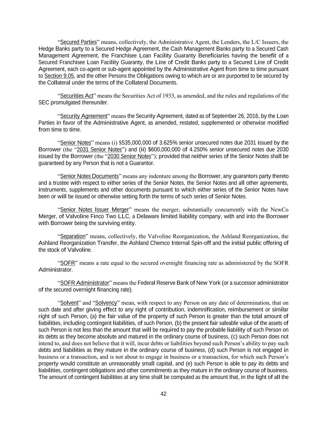 42“有担保当事人”是指行政代理人、贷款人、信用证发行人、有担保对冲协议的对冲银行当事人、有担保现金管理协议的现金管理银行当事人、享有有担保特许人贷款融资担保利益的特许人贷款融资担保受益人、有担保信贷额度协议的信用额度银行当事人、行政代理人根据第9.05条不时指定的每个共同代理人或分代理人,以及根据抵押单证的条款由抵押品担保或据称由抵押品担保所欠债务的其他人。“证券法”是指经修订的1933年《证券法》,以及SEC据此颁布的规则和条例。“担保协议”指贷款双方以行政代理人为受益人、日期为2016年9月26日、经不时修订、重述、补充或以其他方式修改的担保协议。“优先票据”指(i)由借款人发行的2031年到期的535,000,000美元3.625%优先无抵押票据(“2031年优先票据”)和(ii)由借款人发行的2030年到期的600,000,000美元4.250%优先无抵押票据(“2030年优先票据”);但这两个系列的优先票据均不得由非担保人的任何人提供担保。“优先票据文件”是指借款人、其任何担保方和受托人之间就任一系列优先票据、优先票据以及任何一系列优先票据已经或将要发行的所有其他协议、文书、补充和其他文件或以其他方式载明该系列优先票据的条款订立的任何契约。“优先票据发行人合并”是指特拉华州有限责任公司Valvoline Finco Two LLC与借款人的合并,基本上与NewCo合并同时进行,借款人为存续实体。“分立”是指合称的胜牌重组、亚什兰重组、亚什兰重组转让、亚什兰化工内部分拆和首次公开发行股票。“SOFR”是指与SOFR管理人管理的有担保隔夜融资利率相等的利率。“SOFR管理人”是指纽约联邦储备银行(或担保隔夜融资利率的继任管理人)。“偿付能力”和“偿付能力”是指,就任何在任何确定日期的人而言,在该日期以及在该人的任何分担权、赔偿权、偿还权或类似权利生效后,(a)该人的财产的公允价值高于该人的负债总额,包括或有负债,(b)该人的资产的现时公平可售货值不低于该人就其在正常业务过程中成为绝对及到期的债务可能承担的赔偿责任所需支付的金额,(c)该人不打算,亦不相信会因该人在正常业务过程中到期而产生超出其支付该等债务及负债能力的债务或负债,(d)该人并无从事业务或交易,并且不打算从事业务或交易,对于这些业务或交易,该人的财产将构成不合理的小额资本,并且(e)该人能够在正常业务过程中支付其到期的债务和负债、或有债务和其他承诺。任何时候的或有负债数额,应计算为,在考虑到所有