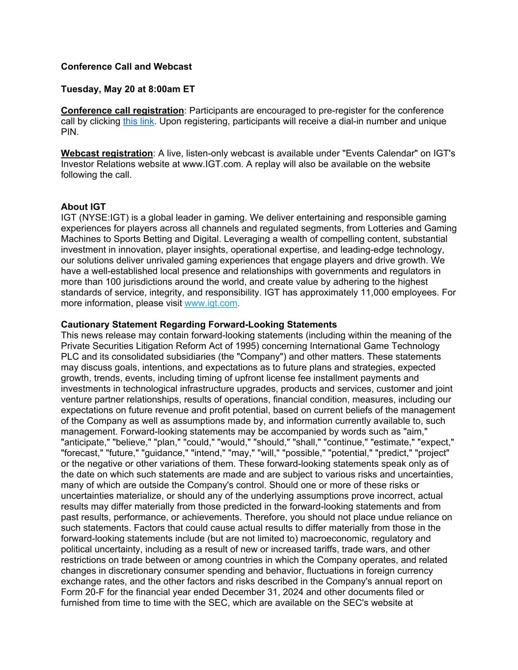 美国东部时间5月20日(星期二)上午8:00举行电话会议和网络直播电话会议登记:鼓励与会者通过点击此链接预先登记参加电话会议。注册后,参与者将获得一个拨入号码和唯一的PIN码。网络直播报名:可在IGT投资者关系网站www.IGT.com的“活动日历”下进行仅供收听的现场网络直播。电话会议结束后,网站上也将提供重播。关于IGTIGT(纽约证券交易所代码:IGT)是一家全球领先的游戏公司。我们为所有渠道和受监管细分市场的玩家提供娱乐性和负责任的游戏体验,从彩票和博彩机到体育博彩和数字。凭借丰富的引人入胜的内容、对创新的大量投资、玩家洞察力、运营专业知识和领先技术,我们的解决方案提供了无与伦比的游戏体验,吸引了玩家并推动了增长。我们与全球100多个司法管辖区的政府和监管机构建立了完善的本地存在和关系,并通过坚持最高标准的服务、诚信和责任来创造价值。IGT拥有约11,000名员工。欲了解更多信息,请访问www.igt.com。关于前瞻性陈述的警示性声明本新闻稿可能包含有关国际游戏科技 PLC及其合并子公司(“公司”)和其他事项的前瞻性陈述(包括1995年《私人证券诉讼改革法案》含义内的陈述)。这些声明可能会讨论目标、意图和对未来计划和战略的预期、预期增长、趋势、事件,包括预付许可费分期付款的时间安排以及对技术基础设施升级、产品和服务、客户和合资伙伴关系、运营结果、财务状况、措施,包括我们对未来收入和利润潜力的预期,这些措施基于公司管理层当前的信念以及此类管理层做出的假设和目前可获得的信息。前瞻性陈述可能附有诸如“目标”、“预期”、“相信”、“计划”、“可能”、“将”、“应该”、“应”、“继续”、“估计”、“预期”、“预测”、“未来”、“指导”、“打算”、“可能”、“将”、“可能”、“潜在”、“预测”、“项目”或它们的负面或其他变体。这些前瞻性陈述仅在做出此类陈述之日起生效,并受到各种风险和不确定性的影响,其中许多风险和不确定性超出了公司的控制范围。如果这些风险或不确定性中的一项或多项成为现实,或者任何基本假设被证明是不正确的,实际结果可能与前瞻性陈述中的预测以及过去的结果、业绩或成就存在重大差异。因此,您不应过分依赖此类声明。可能导致实际结果与前瞻性陈述中的结果存在重大差异的因素包括(但不限于)宏观经济、监管和政治不确定性,包括新的或增加的关税、贸易战以及公司经营所在国家之间或国家之间的其他贸易限制,以及可自由支配的消费者支出和行为的相关变化、外汇汇率波动,以及公司截至12月31日止财政年度的20-F表格年度报告中描述的其他因素和风险,2024和不时向SEC提交或提供的其他文件,可在SEC网站上查阅,网址为