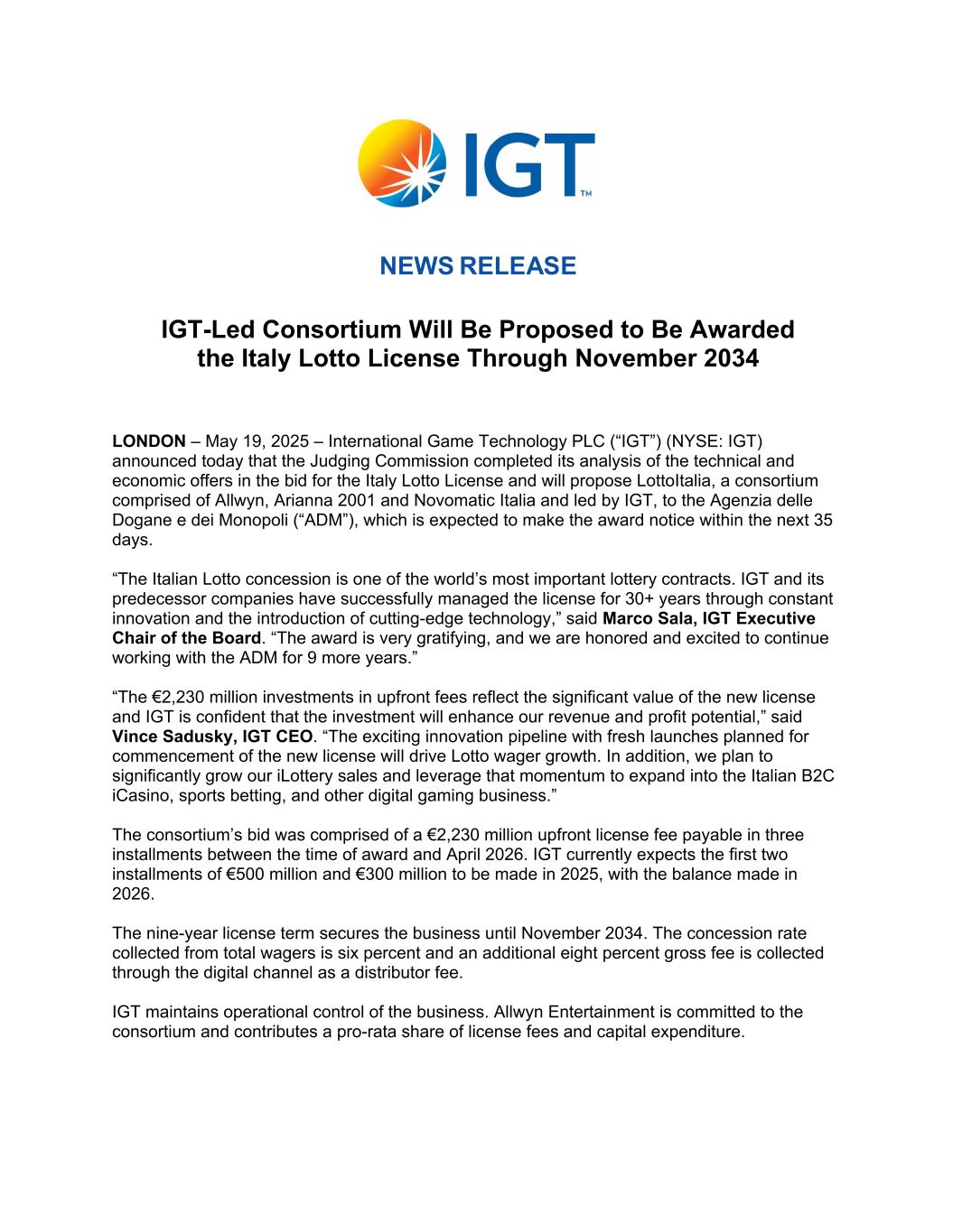 NEWS RELEASE IGT-Led财团将被提议授予截至2034年11月的意大利乐透许可证伦敦– 2025年5月19日– 国际游戏科技 PLC(“IGT”)(纽约证券交易所代码:IGT)今天宣布,评审委员会完成了对意大利乐透许可证竞标中技术和经济报价的分析,将向Agenzia delle Dogane e dei Monopoli(“ADM”)提出LottoItalia(由Allwyn、Arianna 2001和Novomatic Italia组成并由IGT牵头的财团),后者预计将在未来35天内发出授予通知。“意大利大乐透特许权是世界上最重要的彩票合同之一。通过不断创新和引进尖端技术,IGT及其前身公司已经成功管理该许可证30 +年,”IGT董事会执行主席Marco Sala表示。“这个奖项非常令人欣慰,我们很荣幸也很兴奋能与ADM再合作9年。”IGT首席执行官Vince Sadusky表示:“22.3亿欧元的前期费用投资反映出新许可证的重大价值,IGT相信,这些投资将提高我们的收入和利润潜力。”“令人兴奋的创新管道以及计划在新许可证开始时推出的新产品将推动Lotto投注增长。此外,我们计划大幅增加iLottery的销售额,并利用这一势头扩展到意大利的B2C iCasino、体育博彩和其他数字游戏业务。”该财团的出价包括22.3亿欧元的前期许可费,在授标时至2026年4月期间分三期支付。IGT目前预计前两期的5亿欧元和3亿欧元将在2025年支付,余额将在2026年支付。九年的许可期限确保业务到2034年11月。从总赌注中收取的优惠费率为6%,通过数字渠道收取额外的8%毛费作为分销商费用。IGT维持对业务的运营控制。Allwyn Entertainment致力于该财团,并按比例贡献许可费和资本支出的份额。