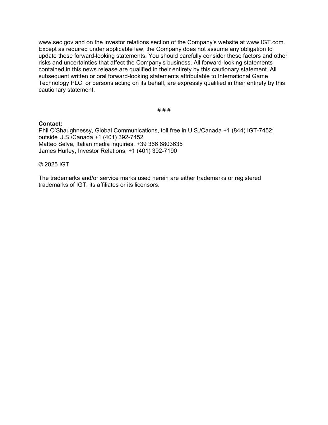 www.sec.gov和公司网站www.IGT.com的投资者关系部分。除适用法律要求外,公司不承担更新这些前瞻性陈述的任何义务。您应该仔细考虑这些因素以及影响公司业务的其他风险和不确定因素。本新闻稿中包含的所有前瞻性陈述均完全符合本警示性陈述的要求。随后归属于国际游戏科技 PLC或代表其行事的人的所有书面或口头前瞻性陈述,均完全受此警示性声明的明确限定。# # #联系人:Phil O'Shaughnessy,Global Communications,美国/加拿大免费电话+ 1(844)IGT-7452;美国/加拿大境外+ 1(401)392-7452 Matteo Selva,意大利媒体查询,+ 393666803635 James Hurley,投资者关系部,+ 1(401)392-7190©2025 IGT此处使用的商标和/或服务标记要么是IGT、其关联公司或其许可人的商标,要么是注册商标。