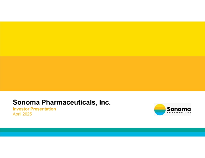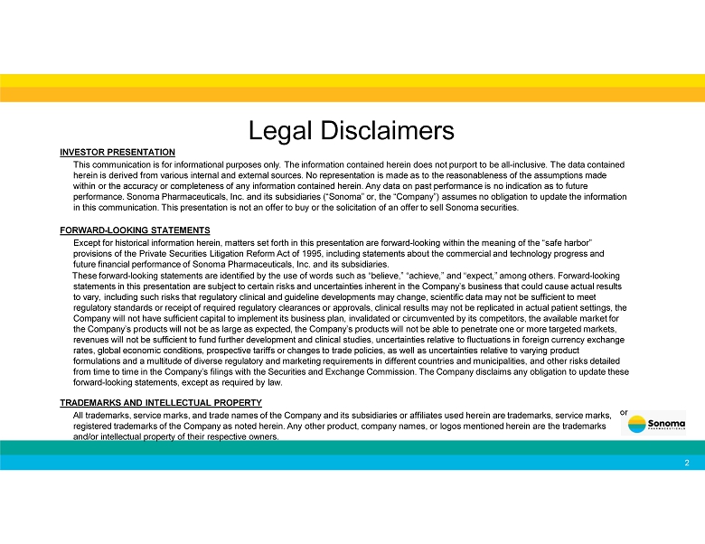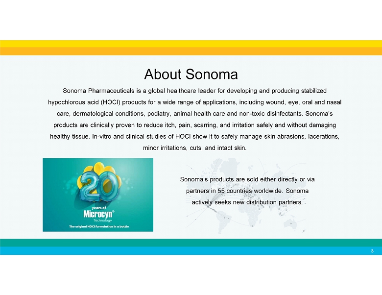法律免责声明或投资者陈述本通讯仅供参考。此处包含的信息并不旨在包含所有内容。本文所包含的数据来源于各种内部和外部来源。不对其中所作假设的合理性或此处包含的任何信息的准确性或完整性作出任何陈述。任何关于过去业绩的数据都不能表明未来的业绩。Sonoma制药,Inc.及其子公司(“Sonoma”或“公司”)不承担更新本通讯中信息的义务。本演示文稿不是购买要约或出售索诺玛证券的要约邀请。前瞻性陈述除此处的历史信息外,本演示文稿中所述事项均为1995年《私人证券诉讼改革法案》“安全港”条款含义内的前瞻性陈述,包括关于Sonoma制药公司及其子公司的商业和技术进展以及未来财务业绩的陈述。这些前瞻性陈述通过使用“相信”、“实现”、“期望”等词语来识别。本演示文稿中的前瞻性陈述受到公司业务固有的某些风险和不确定性的影响,这些风险和不确定性可能导致实际结果有所不同,包括监管临床和指南发展可能发生变化的风险,科学数据可能不足以满足监管标准或收到所需的监管许可或批准,临床结果可能无法在实际患者环境中复制,公司将没有足够的资本来实施其业务计划,被竞争对手无效或规避,公司产品的可用市场将没有预期的那么大,公司的产品将无法打入一个或多个目标市场,收入将不足以资助进一步的开发和临床研究,与外汇汇率波动、全球经济状况、潜在关税或贸易政策变化相关的不确定性,以及与不同产品配方和不同国家和城市的多种不同监管和营销要求相关的不确定性,以及公司不时向美国证券交易委员会提交的文件中详述的其他风险。除法律要求外,公司不承担更新这些前瞻性陈述的任何义务。商标和知识产权此处使用的公司及其子公司或关联公司的所有商标、服务标记、商号均为此处所述公司的商标、服务标记、注册商标。本文提及的任何其他产品、公司名称或徽标均为其各自所有者的商标和/或知识产权。2
