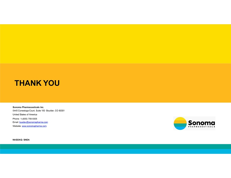 谢谢Sonoma制药 Inc. 5445 Conestoga Court,Suite 150 Boulder,CO 80301美利坚合众国电话:1-(800)759.9305电子邮件:busdev@sonomapharma.com网站:www.sonomapharma.com纳斯达克股票代码:SNOA