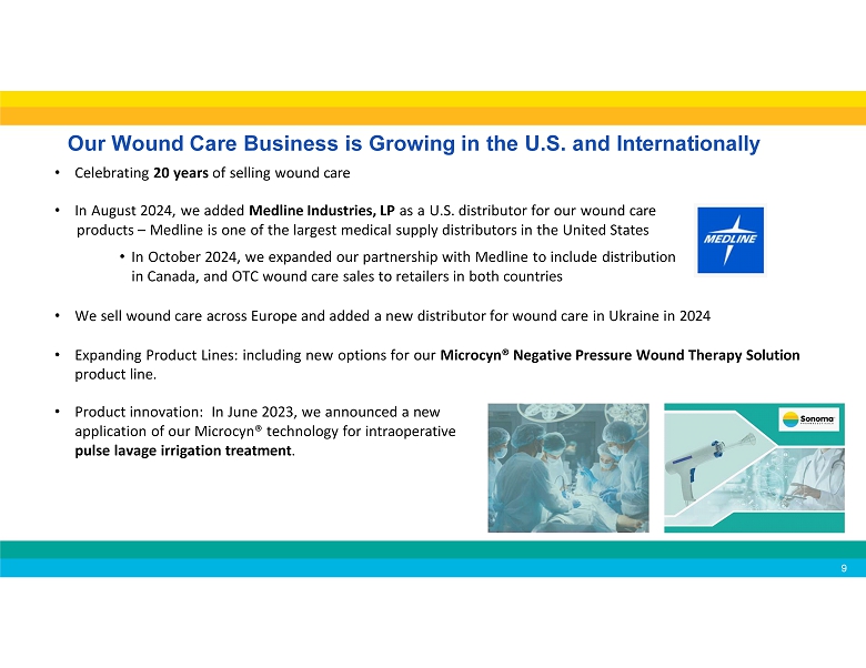 我们的伤口护理业务在美国和国际上都在增长•庆祝销售伤口护理20周年• 2024年8月,我们增加了Medline Industries,LP作为我们伤口护理产品的美国分销商– Medline是美国最大的医疗供应分销商之一• 2024年10月,我们扩大了与Medline的合作伙伴关系,包括在加拿大的分销,和向两国零售商销售OTC伤口护理•我们在欧洲各地销售伤口护理,并于2024年在乌克兰增加了一个伤口护理的新分销商•扩大产品线:包括我们的MicroCyn的新选项®负压伤口治疗解决方案产品线。•产品创新:2023年6月,我们宣布了我们的MicroCYN的新应用®术中脉冲式灌洗冲洗治疗技术。9