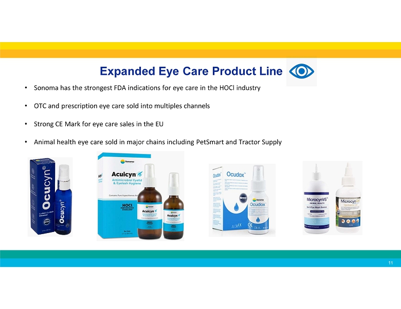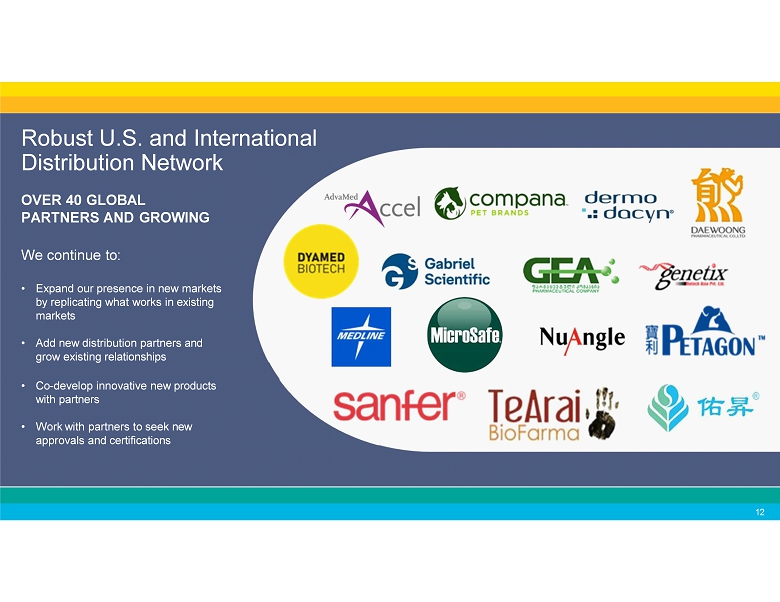 扩大眼部护理产品线• SONoma在HOCL行业拥有最强的眼部护理FDA适应症• OTC和处方眼部护理进入多个渠道销售•在欧盟眼部护理销售获得强有力的CE标志•在包括PetSmart和牵引机供销在内的主要连锁店销售的动物保健眼部护理11