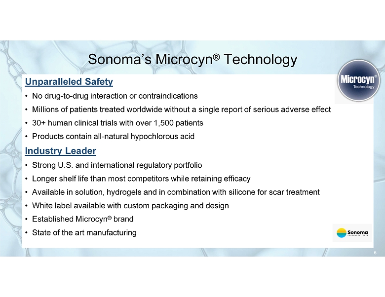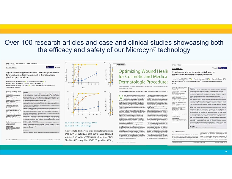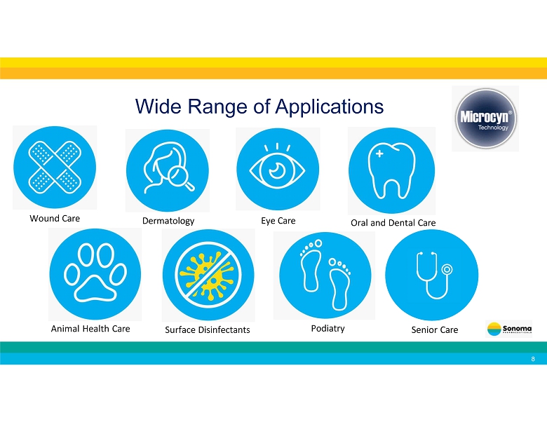 索诺玛的MicroCyn®技术无与伦比的安全性•没有药物对药物的相互作用或禁忌症•全球数百万患者接受治疗,没有一份严重不良反应的报告• 30多项人体临床试验,超过1500名患者•产品包含所有-天然次氯酸行业领导者•强大的美国和国际监管组合•比大多数竞争对手更长的保质期,同时保持功效•可提供溶液、水凝胶和与硅胶联合用于疤痕治疗•可提供定制包装和设计的白标•已建立的Microcyn®品牌•最先进的制造6