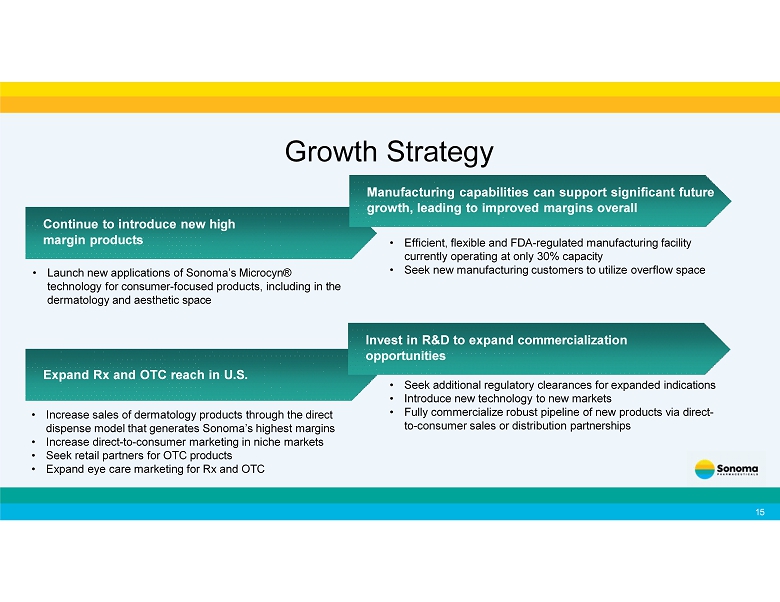 持续推出新的高利润率产品制造能力可支持未来显著增长,导致整体利润率改善•推出Sonoma的MicroCYN新应用®以消费者为中心的产品的技术,包括在皮肤科和美学空间增长战略•高效,灵活且受FDA监管的制造设施目前仅以30%的产能运行•寻求新的制造客户以利用溢出空间扩大RX和OTC在美国的覆盖范围•通过直接分配模式增加皮肤科产品的销售产生Sonoma最高利润率•在利基市场增加直接面向消费者的营销•寻求OTC产品的零售合作伙伴•扩大RX和OTC的眼部护理营销15投资研发以扩大商业化机会•为扩大的适应症寻求额外的监管许可•将新技术引入新市场•通过直接面向消费者的销售或分销合作伙伴关系,全面商业化强大的新产品管道