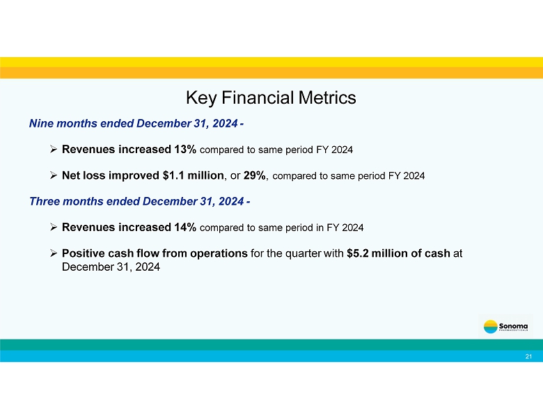 主要财务指标21截至2024年12月31日的九个月-»营收较2024财年同期增长13% »净亏损较2024财年同期改善110万美元,或29%截至2024年12月31日的三个月-»营收较2024财年同期增长14% »本季度经营活动产生的正现金流,截至2024年12月31日现金为520万美元