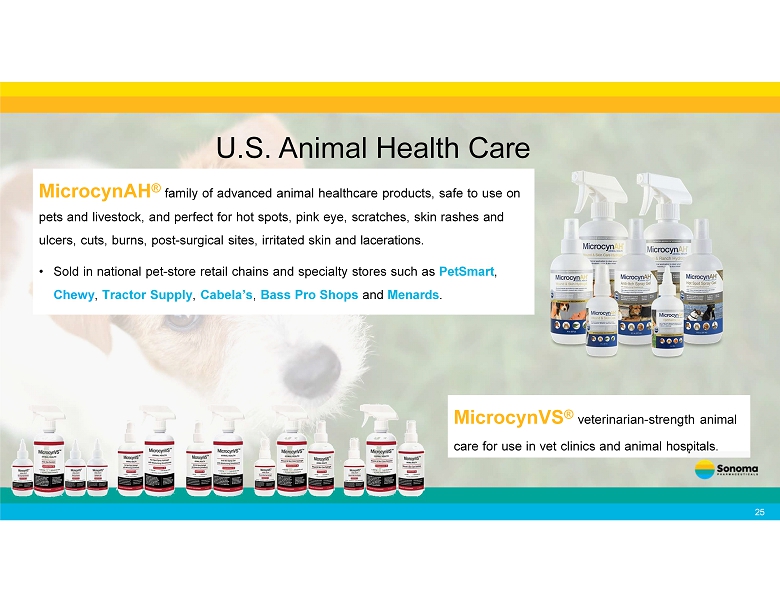 美国动物保健国际护理MicrocynAH®先进的动物保健产品家族,可安全用于宠物和家畜,非常适合热点、红眼病、抓伤、皮肤皮疹和溃疡、割伤、烧伤、术后部位、受刺激的皮肤和撕裂伤。•在PetSmart、Chewy、牵引机供销、Cabela’s、Bass Pro Shops and Menards等全国宠物店零售连锁店和专卖店有售。MicroCYNVS®兽医-力量动物护理,用于兽医诊所和动物医院。25