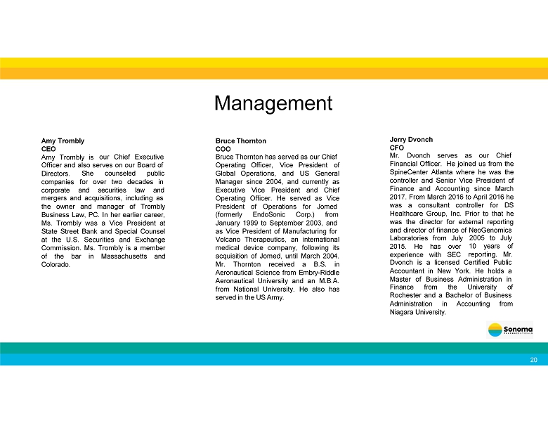 管理层Amy Trombly首席执行官Amy Trombly是我们20岁的首席执行官,也是我们董事会的成员,她为公共董事提供咨询服务。公司在证券法和并购领域拥有超过二十年的公司历史,包括作为Trombly Business Law,PC的所有者和经理。在其早期职业生涯中,Trombly女士曾担任道富银行的副总裁和美国证券交易委员会的特别顾问。Trombly女士是马萨诸塞州和科罗拉多州的律师协会成员。Bruce Thornton首席运营官Bruce Thornton自2004年起担任我们的首席运营官、全球运营副总裁、美国区总经理,现任执行副总裁兼首席运营官。他曾于1999年1月至2003年9月担任Jomed(前身为EndoSonic Corp.)的运营副总裁,并在收购Jomed后担任国际医疗设备公司Volcano Therapeutics的制造副总裁,直至2004年3月。桑顿先生获得安柏瑞德航空大学航空科学B.和国立大学M. B. A.。他还曾在美国陆军服役。Jerry Dvonch首席财务官Mr. Dvonch担任我们的首席财务官。他从亚特兰大SpineCenter加入我们,自2017年3月起担任财务和会计总监兼高级副总裁。2016年3月至2016年4月,他担任DS Healthcare Group,Inc.的顾问控制人。在此之前,他于2015年7月起担任NeoGenomics Laboratories的外部报告总监和财务总监。他在SEC 2005年至7月的10年报告中拥有超额经验。Dvonch先生是纽约的持牌注册会计师。他拥有罗切斯特大学金融工商管理硕士学位和尼亚加拉大学会计学工商管理学士学位。