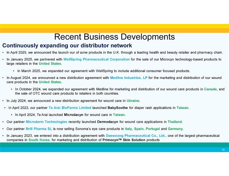 通过投资研发扩大商业化机会•我们成功地将我们在欧洲的所有商业化产品,包括眼部护理、伤口护理、疤痕凝胶、痤疮产品和特应性皮炎产品过渡到新的欧盟(EU)医疗器械法规(MDR)。•我们的制造工厂和我们的五种产品已在英国的药品和保健产品监管局(MHRA)成功注册,包括我们的伤口冲洗液和水凝胶、疤痕管理产品和痤疮产品。• 2024年,我们从FDA获得了两项新的510(k)许可,包括面部、眼睑和睫毛的特定非处方适应症,以及我们基于MicroCYN的溶液和水凝胶的生物相容性得到改善。• 2023年3月,我们宣布了Nanocyn的新EPA索赔®院院级消毒剂,有效用于抗MRSA、沙门氏菌、诺如病毒、脊髓灰质炎病毒,并作为杀菌剂。Nanocyn此前被批准用于对抗COVID-19和新出现的病原体,包括埃博拉病毒、MPOX和SARS-CoV-2。Nanocyn也收到了备受推崇的绿印®认证。2024年8月,澳大利亚TGA批准了针对C. auris和C. diff的新索赔。TM • Reliefacyn®Advanced ITCH-Burn-Rash-Pain Relief Hydrogel获N ATIONAL E CZEMA A SSOCIATION S EAL of a CCEPTANCE •最近发表在《神经泌尿学和泌尿动力学》杂志上的一篇文章强调了MicroDox的潜力®用于治疗神经源性或非神经源性膀胱功能障碍患儿的尿路感染或尿路感染。1 1.Singh G-K,Deshpande A,Schlegel G,Starkey M,Taghavi K.神经性膀胱患儿膀胱冲洗的基本原理。Neurourol Urodyn。2024;1-6. DOI:10.1002/nau.25450近期业务发展18