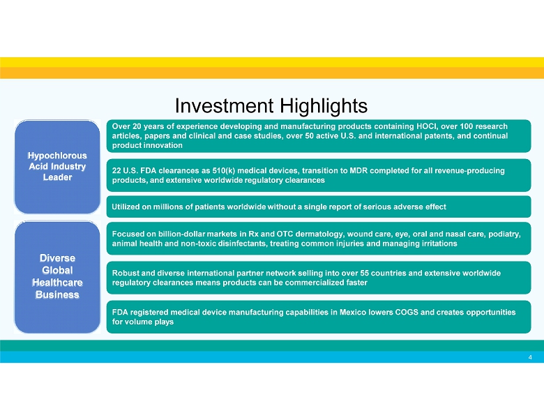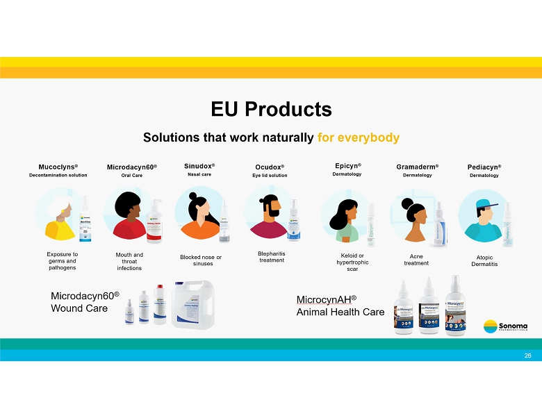 关于Sonoma Sonoma制药是一家全球医疗保健领先企业,致力于开发和生产稳定的次氯酸(HOCL)产品,应用领域广泛,包括伤口、眼睛、口腔和鼻腔护理、皮肤病、足病、动物保健和无毒消毒剂。Sonoma的产品已被临床证明可以安全地减少瘙痒、疼痛、疤痕和刺激,并且不会损害健康组织。HOCL的体外和临床研究表明,它可以安全地管理皮肤擦伤、撕裂伤、轻微刺激、割伤和完整的皮肤。索诺玛的产品在全球55个国家直接或通过合作伙伴销售。索诺玛积极寻找新的分销合作伙伴。3