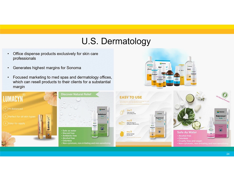 行业-领先的安全有效的皮肤病产品•缓解特应性皮炎症状、减少疤痕和日常皮肤护理的产品•针对不断增长的med spa市场的一系列办公室分配产品•湿疹印章批准•所有天然成分•没有有害化学物质•提供OTC、办公室分配和RX产品•提供创新包装,包括高端和具有成本竞争力的选择•持续的产品创新:于2024年推出Lumacyn TM Clarifying Mist,这是一种日常爽肤水,旨在通过减少感染来减少发红和管理瑕疵。10