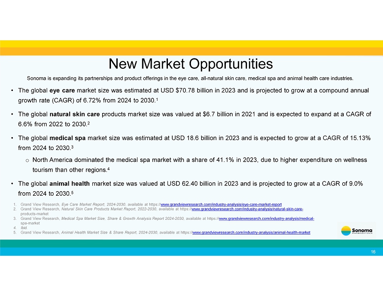 新的市场机遇Sonoma正在扩大其在眼部护理、全天然皮肤护理、医疗水疗和动物保健行业的合作伙伴关系和产品供应。• 2023年全球眼部护理市场规模估计为707.8亿美元,预计2024-2030年将以6.72%的复合年增长率(CAGR)增长。1 • 2021年全球天然护肤品市场规模估值为67亿美元,预计2022-2030年将以6.6%的复合年增长率扩张。2 • 2023年全球医疗水疗市场规模估计为186亿美元,预计2024-2030年将以15.13%的复合年增长率增长。3 o由于健康旅游支出高于其他地区,2023年北美以41.1%的份额主导了医疗水疗市场。4 • 2023年全球动物保健市场规模为624.0亿美元,预计2024-2030年将以9.0%的复合年增长率增长。5 1.Grand View Research,Eye Care Market Report,2024-2030,available at https://www.grandviewresearch.com/industry-analysis/eye-care-market-report 2。Grand View Research,Natural Skin Care Products Market Report,2022-2030,available at https://www.grandviewresearch.com/industry-analysis/natural-skin-care-products-market 3。Grand View Research,Medical Spa Market Size,Share & Growth Analysis Report 2024-2030,available at https://www.grandviewresearch.com/industry-analysis/medical-spa-market 4。同上。5.Grand View Research,2024-2030年动物保健国际市场规模和份额报告,可在https://www.grandviewresearch.com/industry-analysis/animal-health-market16查阅
