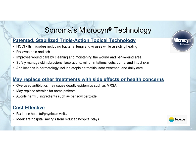 索诺玛的MicroCYN®技术专利,稳定的三重作用外用技术• HOCL在帮助愈合的同时杀死细菌、真菌和病毒等微生物•缓解疼痛和瘙痒•通过清洁和润湿伤口和伤口周围区域来改善伤口护理•安全管理皮肤擦伤、撕裂伤、轻微刺激、割伤、烧伤和完整皮肤•在皮肤病学中的应用包括特应性皮炎,疤痕治疗和日常护理可能会取代具有副作用或健康问题的其他治疗方法•过度使用抗生素可能会导致致命的流行病,如MRSA •可能会为一些患者取代类固醇•避免过氧化苯甲酰等有害成分具有成本效益•减少医院/医生就诊次数•减少住院时间带来的医疗保险/医院节省5