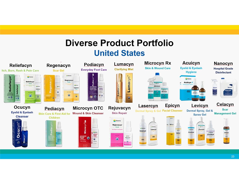 次氯酸行业领导者次氯酸行业领导者22美国FDA批准为510(k)医疗设备、所有创收产品完成向MDR的过渡,以及对全球数百万患者使用的广泛的全球监管许可,没有一份严重不良影响的报告,重点关注RX和OTC皮肤病学、伤口护理、眼科、口腔和鼻腔护理、足病、动物保健和无毒消毒剂领域价值数十亿美元的市场,治疗常见损伤和管理刺激物多样化的全球医疗保健业务多样化的全球医疗保健业务投资亮点20多年来开发和制造含有HOCL的产品的经验,超过100篇研究文章、论文以及临床和案例研究,超过50项活跃的美国和国际专利,以及持续的产品创新稳健而多样的国际合作伙伴网络销往超过55个国家,广泛的全球监管许可意味着产品可以更快地商业化FDA在墨西哥注册的医疗器械制造能力降低了COGS并为批量播放创造了机会4