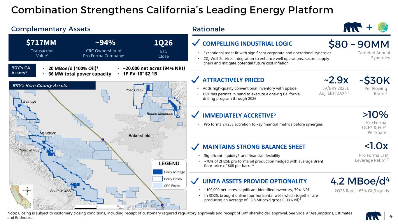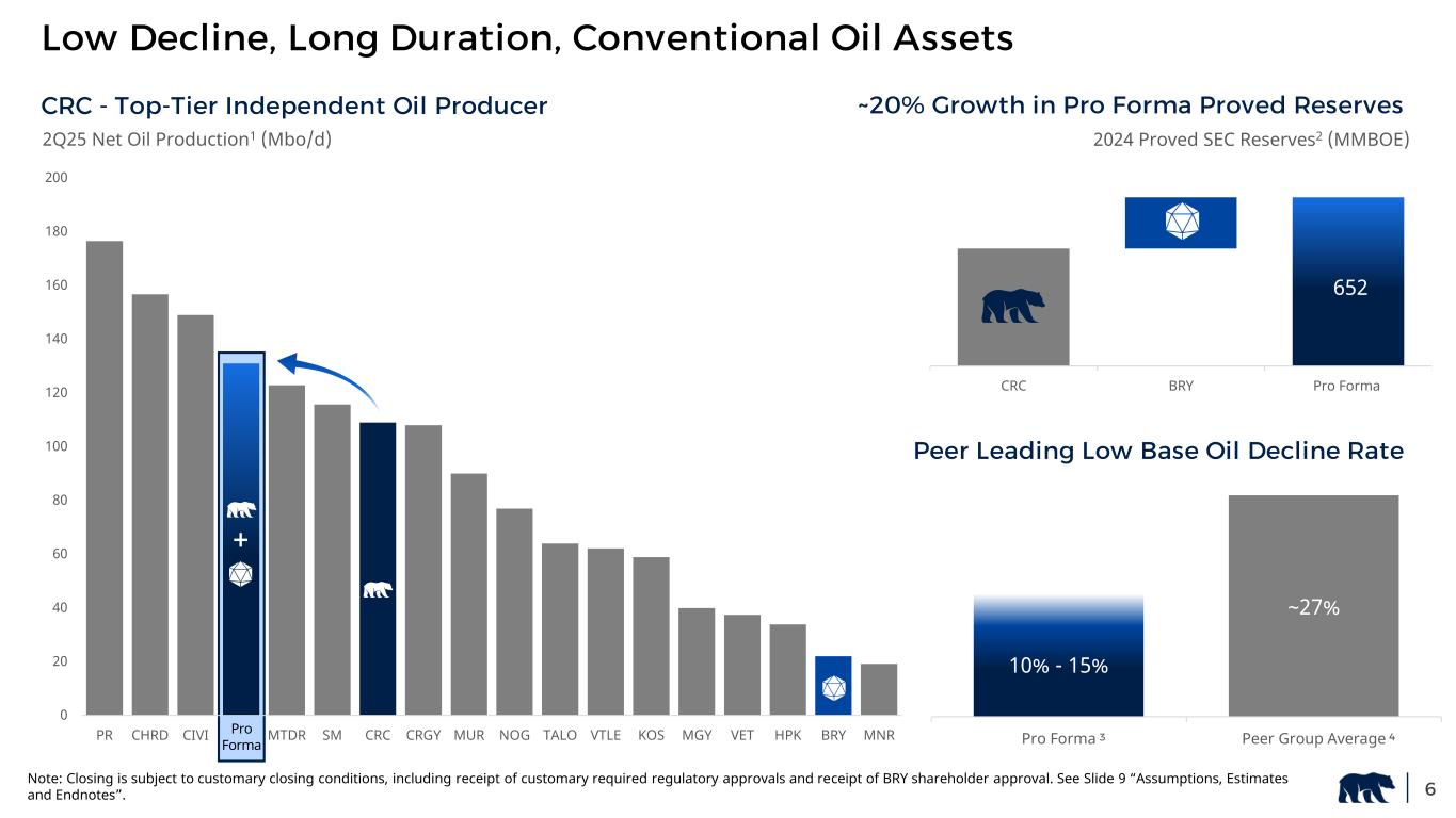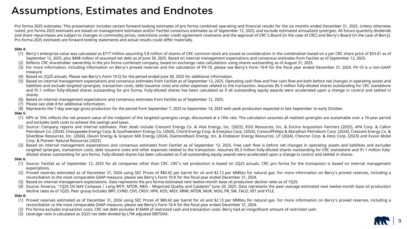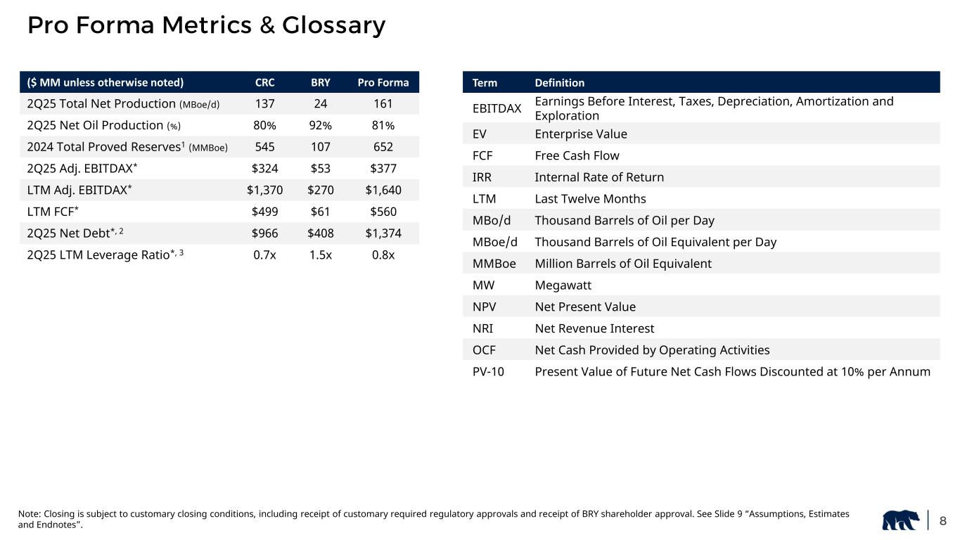 假设、估计和尾注2025年预估。本演示文稿包括对截至2025年12月31日止六个月的备考合并经营和财务业绩的某些前瞻性估计。除非另有说明,预计2025年的估计是基于截至2025年9月12日的管理层估计和/或FactSet共识估计,不包括估计的年化协同效应。所有未来的季度股息和股票回购都取决于商品价格的变化、信贷协议契约的限制以及CRC董事会(在CRC的情况下)和Berry’s董事会(在Berry的情况下)的批准。预计2025年的估计是前瞻性陈述,实际结果可能存在重大差异。幻灯片4:(1)Berry的企业价值计算为7.17亿美元,假设根据截至2025年9月12日的每股CRC股价53.01美元,加上截至2025年6月30日的4.08亿美元假定净债务,在合并中发行580万股CRC普通股作为对价。基于内部管理层预期和FactSet截至2025年9月12日的一致估计。(2)反映CRC股东在备考合并公司中的所有权,基于使用截至2025年8月31日的已发行股份的交换比率计算。(3)有关更多信息,包括有关Berry探明储量和PV-10计算的信息,请参阅Berry截至2024年12月31日的财政年度的10-K表格。PV-10是一种非GAAP衡量标准。(4)基于2Q25实际。有关更多信息,请参阅Berry截至2025年6月30日止期间的10-Q表格。(5)基于FactSet截至2025年9月12日的内部管理层预期和一致估计。经营现金流和自由现金流均为经营资产和负债净变动前,不包括目标协同效应、交易成本、债务发行成本以及与交易相关的其他费用。假设CRC独立发行在外的完全稀释股份为8530万股,备考发行在外的完全稀释股份为9110万股。全面摊薄股份的计算如同所有未行使的股权奖励在控制权发生变更时加速并以股份结算。(6)基于内部管理层预期和FactSet截至2025年9月12日的一致估计。(7)更多信息请看幻灯片8。(8)表示2025年9月7日至2025年9月14日期间的7天平均毛产量,预计在9月底至10月初达到峰值产量。幻灯片5:(1)10%的NPV反映了目标协同效应区间中点的净现值,按10%的比率贴现。该计算假设所有已实现的协同效应在10年期间是可持续的,并且不包括实现节约的成本和税收。(2)资料来源:公司报告及内部预估。同行交易包括Crescent Energy & Vital Energy,Inc.(2025)、EOG能源,Inc. & Encino Acquisition Partners(2025)、APA Corp. & 卡隆石油 Co.(2024)、TERM0 Energy 切萨皮克能源 Corp. & 西南能源 Co.(2024)、Chord Energy Corp. & 艾诺加能源基金 Corp.(2024)、ConoCoPhillips & Marathon Petroleum 马拉松原油 Corp.(2024)、Crescent Energy Co. & SilverBow Resources,Inc.(2024)、戴文能源 & Grayson Mill Energy(2024)、(3)基于FactSet截至2025年9月12日的内部管理层预期和一致预期。自由现金流是在经营资产和负债净变动之前,不包括目标协同效应、交易成本、债务发行成本和与交易相关的其他费用。假设CRC独立发行的完全稀释流通股为8530万股,备考发行的完全稀释流通股为9110万股。全面摊薄后的股份已计算,如同所有未行使的股权奖励在控制权发生变更时加速并以股份结算。幻灯片6:(1)来源:FactSet截至2025年9月12日,除CRC之外的所有公司。CRC的净产量基于2Q25实际值。CRC对该交易的备考是基于内部管理层的预期。(2)使用SEC价格估算截至2024年12月31日的探明储量,石油价格为每桶80.42美元,天然气价格为每百万英热单位2.13美元。有关Berry探明储量的更多信息,包括与最具可比性的GAAP衡量标准的对账,请参阅Berry截至2024年12月31日的财政年度的10-K表格。(3)基于内部管理预期。数据代表截至25年第一季度的预估未来12个月基础油产量下降率。(4)资料来源:Enverus,“1Q25 Oil NAV Compass |做多WCP、MTDR,MEG –错误定价的质量和催化剂”,2025年6月20日。数据代表截至25年第一季度同行平均估计的未来12个月基础油产量下降率。同行群组包括BRY, CHRD、CIVI、CRGY、HPK、KOS、MGY、MNR、MTDR、MUR、NOG、PR、SM、TALO、VET和VTLE。幻灯片8:(1)使用SEC价格估算的截至2024年12月31日的探明储量,石油价格为每桶80.42美元,天然气价格为每百万英热单位2.13美元。有关Berry探明储量的更多信息,包括与最具可比性的GAAP衡量标准的对账,请参阅Berry截至2024年12月31日的财政年度的10-K表格。(2)备考不包括交易费用。CRC净债务不包括1600万美元的受限现金和交易成本。贝瑞的受限现金数额微乎其微。(3)杠杆率计算方法为2Q25净债务除以LTM调整后EBITDA。9