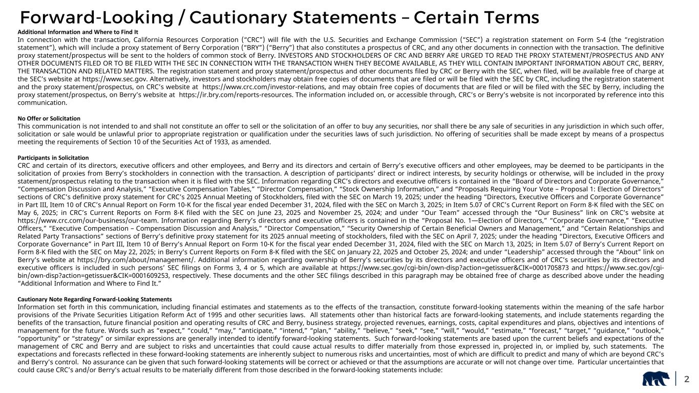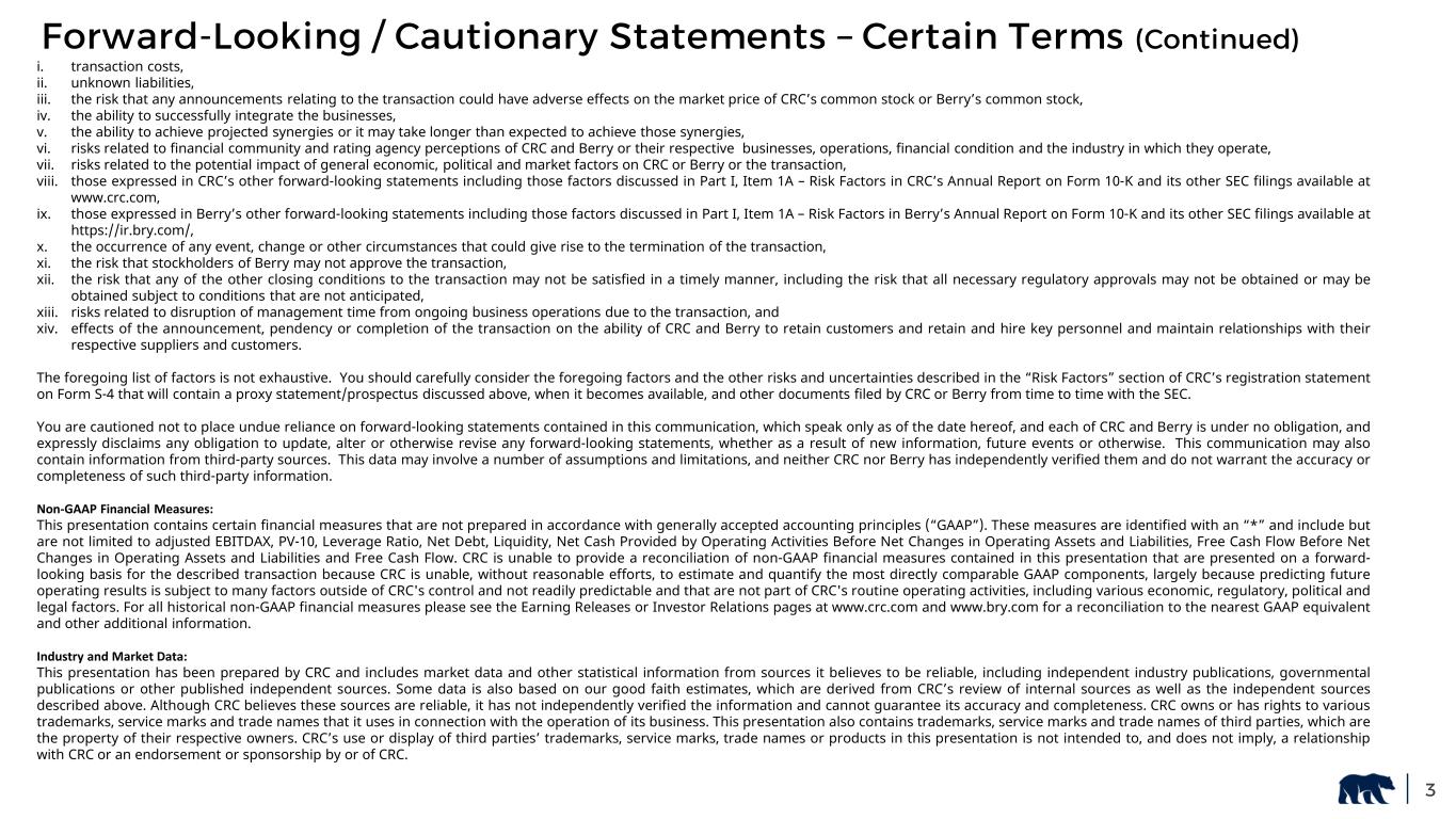 一、交易成本,二、未知负债,三、与交易有关的任何公告可能对CRC普通股或Berry普通股的市场价格产生不利影响的风险,四、成功整合业务的能力,五、实现预计协同效应的能力或实现这些协同效应的时间可能比预期的要长,六、与金融界和评级机构对CRC和Berry或其各自业务、运营、财务状况和所处行业的看法相关的风险,七、与一般经济潜在影响相关的风险,CRC或Berry或交易的政治和市场因素,七、CRC其他前瞻性陈述中表达的那些因素,包括第一部分第1A项中讨论的那些因素—— CRC的10-K表格年度报告中的风险因素以及可在www.crc.com上查阅的其他SEC文件,六、Berry其他前瞻性陈述中表达的那些因素,包括第一部分第1A项中讨论的那些因素—— Berry的10-K表格年度报告中的风险因素以及可在https://ir.bry.com/,x上查阅的其他SEC文件中的风险因素。任何事件的发生,可能导致交易终止的变化或其他情况,xi.贝瑞股东可能无法批准交易的风险,xii.可能无法及时满足交易的任何其他成交条件的风险,包括可能无法获得所有必要的监管批准或可能在未预期的条件下获得的风险,xiii.与因交易导致正在进行的业务运营中断管理时间相关的风险,以及xiv.公告的影响,交易的未决或完成取决于CRC和Berry留住客户、留住和雇用关键人员以及与各自供应商和客户保持关系的能力。上述因素清单并非详尽无遗。您应仔细考虑上述因素以及CRC在表格S-4上的注册声明中“风险因素”部分中描述的其他风险和不确定性,其中将包含上述讨论的代理声明/招股说明书,以及CRC或Berry不时向SEC提交的其他文件。请注意,不要过分依赖本通讯中包含的前瞻性陈述,这些陈述仅在本通讯发布之日发表,CRC和Berry各自不承担任何义务,并明确表示不承担任何更新的义务,改变或以其他方式修改任何前瞻性陈述,无论是由于新信息、未来事件或其他原因。该通信还可能包含来自第三方来源的信息。该数据可能涉及多项假设和限制,CRC和贝瑞均未对其进行独立验证,不保证此类第三方信息的准确性或完整性。非GAAP财务指标:本演示文稿包含某些未根据公认会计原则(“GAAP”)编制的财务指标。这些措施被确定为“*”,并包括但不限于调整后的EBITDA、PV-10、杠杆率、净债务、流动性、经营活动提供的经营资产和负债净变动前的净现金、经营资产和负债净变动前的自由现金流和自由现金流。CRC无法提供本演示文稿中包含的非公认会计原则财务指标的对账,这些指标是在所描述交易的前瞻性基础上提出的,因为CRC无法在没有合理努力的情况下估计和量化最直接可比的公认会计原则组成部分,主要是因为预测未来的经营业绩受到CRC无法控制且不易预测的许多因素的影响,这些因素不属于CRC日常经营活动的一部分,包括各种经济、监管、政治和法律因素。有关所有历史非GAAP财务指标,请参阅收益发布或投资者关系页面,网址为www.crc.com和www.bry.com,以获得与最接近的GAAP等值的对账和其他额外信息。行业和市场数据:本演示文稿由CRC编制,包括市场数据和来自其认为可靠来源的其他统计信息,包括独立的行业出版物、政府出版物或其他已发布的独立来源。一些数据也是基于我们的善意估计,这些估计来自CRC对内部来源以及上述独立来源的审查。尽管CRC认为这些消息来源是可靠的,但它没有独立核实这些信息,无法保证其准确性和完整性。CRC拥有或拥有各种商标的权利, 服务标志和商品名称,其在业务运营中使用。本演示文稿还包含第三方的商标、服务标记和商号,它们是各自所有者的财产。CRC在本演示文稿中使用或展示第三方的商标、服务标记、商品名称或产品并非旨在也不意味着与CRC有关系或由CRC或CRC背书或赞助。前瞻性/警示性声明–若干条款(续)3