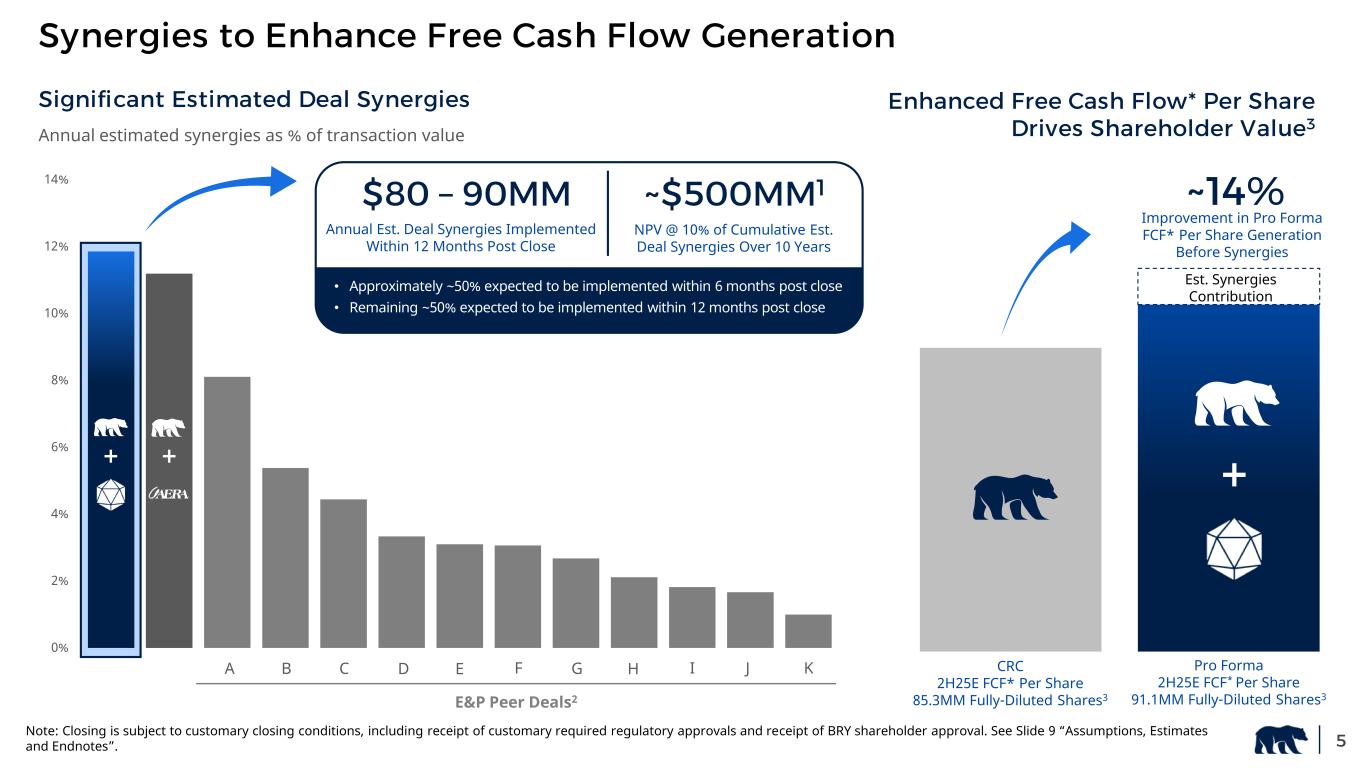 0% 2% 4% 6% 8% 10% 12% 14% $ 80 – 90mm年度估计。12个月内实施的交易协同效应在收盘后NPV @累计EST的10%。10年以上的交易协同效应~500MM1美元5年度估计协同效应占交易价值的百分比E & P同行交易2 A B C D E F G H I J K增强自由现金流*每股驱动股东价值3~14% CRC 2H25E FCF*每股85.3mm全面摊薄股份3 +备考2H25E FCF*每股91.1mm全面摊薄股份3改善备考FCF*协同效应+ +前的每股生成•约~50%预计在收盘后6个月内实施•剩余~50%预计在收盘后12个月内实施。协同效应贡献注:交割须遵守惯例成交条件,包括收到惯常要求的监管批准和收到BRY股东批准。见幻灯片9“假设、估计和尾注”。增强自由现金流产生的5种协同效应显着的估计交易协同效应