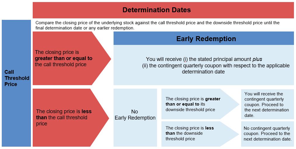 如果最终确定日以外的任何确定日标的股票的收盘价大于或等于赎回阈值价格,则该证券将自动赎回,赎回金额等于紧接相关确定日之后的第一个或有息票支付日的提前赎回款项。一旦证券被赎回,将不会再支付任何款项。 |