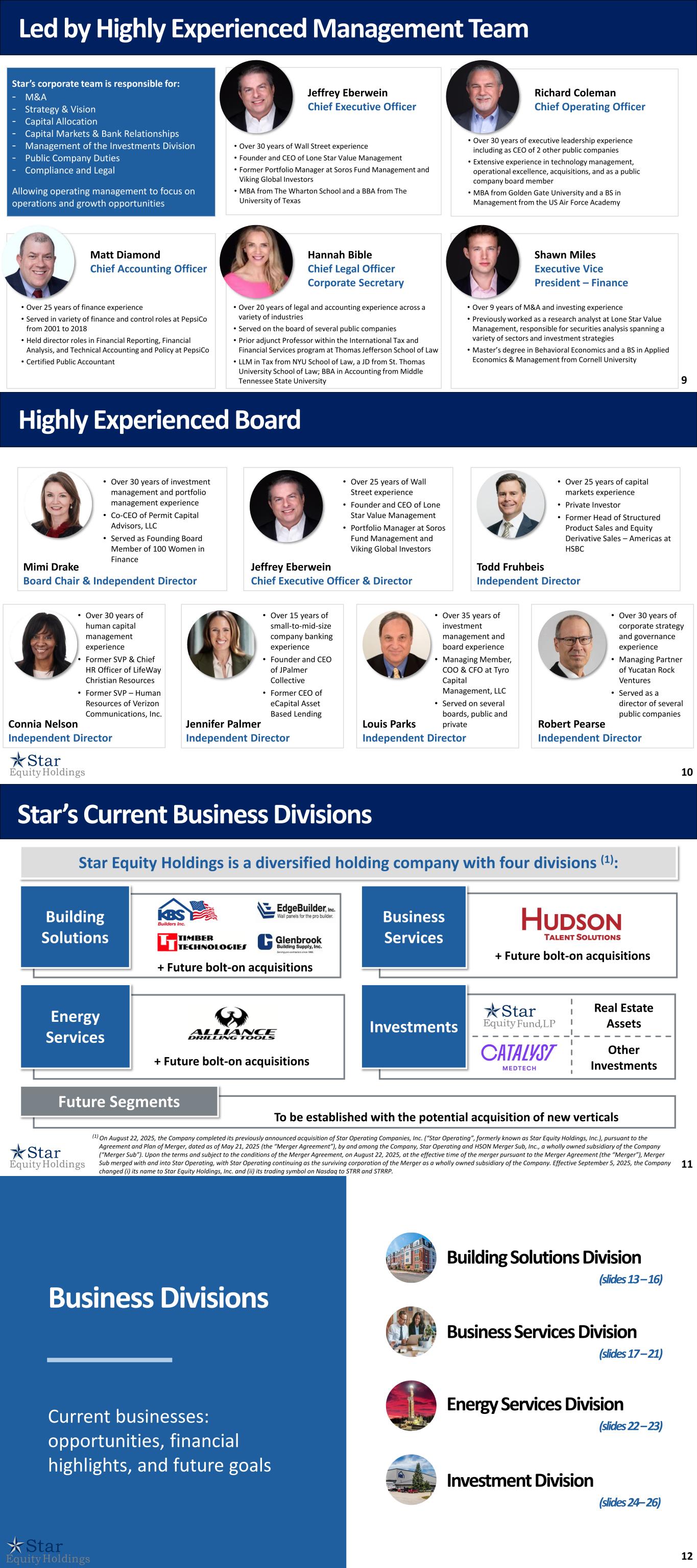 5资本Structure &估值指标(1)包括受限制的现金和应收经纪商款项净额500万美元。(2)截至06/30/2025的备考。(3)不动产账面总值。(4)不含经营租赁。(5)基于每股10.00美元的清算优先权。(6)截至2025年9月12日止。(7)基于彭博一致估计的截至YE2025年普通股权益的估计账面价值(即扣除清算优先权的优先股)。(八)不含经营租赁。(9)不含经营租赁、投资、不动产、STRRP。资本Structure选择估值指标现金(1)(2)2770万美元房地产(2)(3)1000万美元公共投资(2)200万美元私人投资(2)1030万美元经营业务总债务(2)(4)1430万美元现金减去债务(“净现金”)(2)1340万美元优先股(2)(5)2690万美元已发行普通股(2)350万美元股价(6)9.37美元账面价值(“BV”)(7)4930万美元市值(6)3280万美元优先股(2)(5)2690万美元现金减去债务(“净现金”)(2)(13.4美元)百万企业价值(a)(8)4630万美元优先股(2)(5)(26.9美元)百万M Real Estate(2)(3)($ 10.0)M Enterprise Value(b)(9)($ 2.9)M 6Star的并购机会和团队积极寻求公共和私人收购机会,以增加我们已经强劲的有机增长;Star的内部团队有能力处理从想法产生到交易的投资生命周期的各个方面,类似于PE公司的团队(1)彭博社的数据。(2)根据Ballard Spahr LLP。(3)根据Kreischer Miller家族企业调查。上市公司机会集•美国超过4000家EBITDA低于3000万美元的上市公司(1)o上市的成本和复杂性不断上升o Star是精选微型股的逻辑聚合器,上市公司和多余的间接费用可以在其中消除,为股东增加价值私人公司机会集•大的高质量子集,拥有所有权的私营小企业寻求退出•人口趋势,如婴儿潮一代退休的“银发海啸”,表明企业所有权过渡的增加o an est。美国有1200万婴儿潮一代拥有私营企业;约400万人年收入在5-1亿美元(2)o~45%的家族企业缺乏继任计划(3)自2022年以来,Star的并购团队完成了以下交易:1。2023年以4000万美元将Digirad Health,Inc.出售给PE旗下的TTG Imaging Solutions,LLC 2。收购三家私营公司:I. Big Lake Lumber(‘23)、Timber Technologies(‘24)、Alliance Drilling Tools(‘25)3。投资于Servotronics, Inc.(NYSE:SVT),在出售给NYSE:TDG 4后产生约340%的回报。投资Superior Drilling Tools(NYSE:SDPI),该公司被NASDAQ收购:DTI Star的并购团队包括:1。STRR管理(见幻灯片9)2。三位金融/研究分析师3。内部法律团队7 •收入在1000万至5000万美元、EBITDA超过200万美元的企业•具有增长潜力和强大的本地运营管理团队的企业•现有资产、收益、和现金流(没有初创企业或风险资本型情况)•对公开交易或私人持有的企业开放o小型公众公司这将在我们的控股公司结构内更有价值•要么是具有未来可能的补强收购目标的平台公司,要么是现有Star运营业务的补强收购标准:•寻找收购目标在Star内部更有价值的情况•腾出运营管理团队,以最大限度地提高运营和追求增长机会•改善运营和财务绩效•改善获得资本的机会并降低资本成本•支持补强收购勤勉运营公司的执行和执行•通过降低SG & A和/或上市公司成本实现成本协同效应o共享某些公司职能以减少公司间接费用收购目标:现有的Star Verticals:•建筑/建筑解决方案/住房/建筑材料•人员配置/商业服务• 美国能源服务 Star潜在的新垂直领域:•运输/物流•工业/制造•材料•没有初创企业或VC类型的情况首选行业包括:Star的并购战略8(1)公众行动主义努力并不总是追求收购。差异化的公司战略和Structure 1通过有机增长实现快速盈利的规模35采用长期合作方式而不是短期交易方式24由于开放式投资时间跨度,拥有灵活的持有期6成为符合Star收购标准的精选微型股的逻辑聚合者类似于私募股权,但具有关键区别,让Star可以:利用现金、债务和普通&优先股的组合,向交易对手提供灵活的交易结构,同时追求私人和公共收购目标, 有时通过行动主义(1)中期目标(~5年)1。跑赢罗素2000指数2。加入罗素2000指数