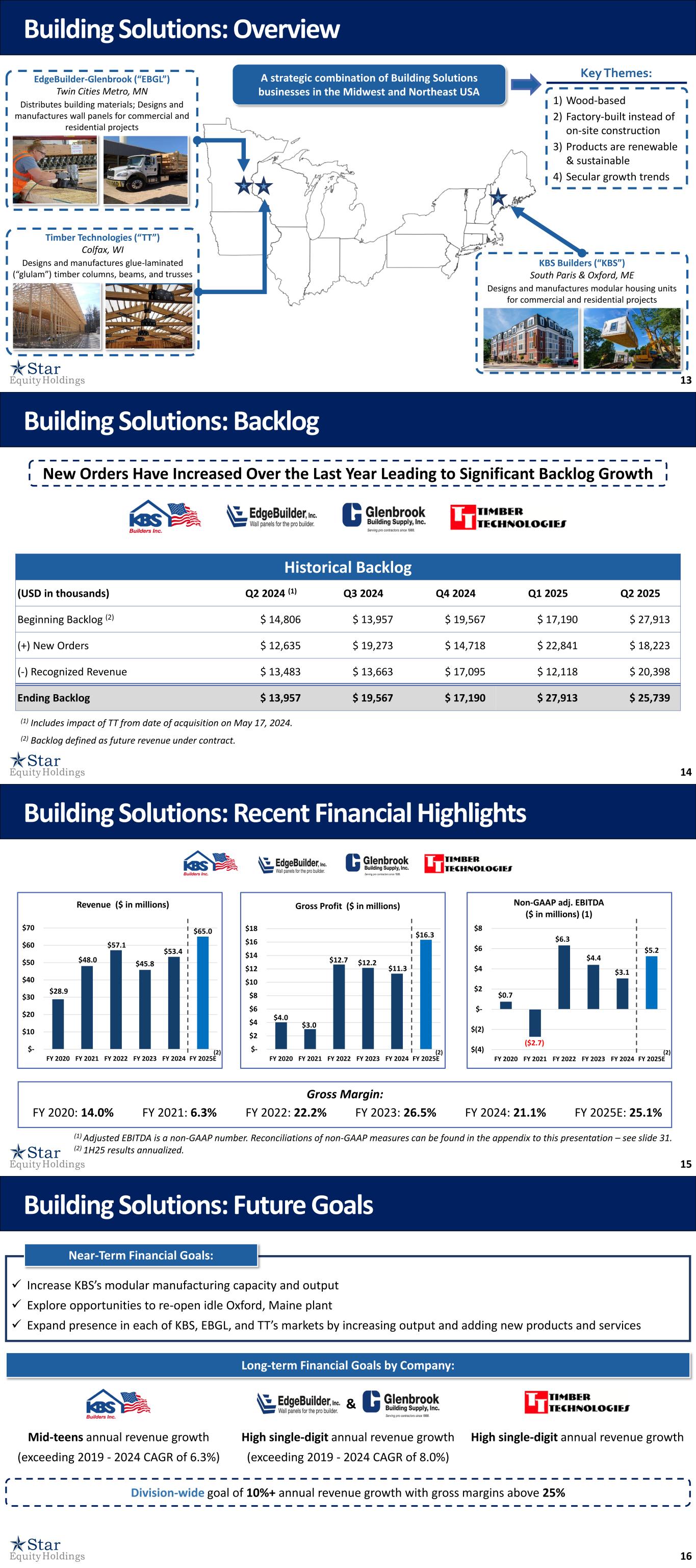 13 Timber Technologies(“TT”)Colfax,WI设计和制造胶合层压(“胶合层”)木材柱、梁和桁架KBS Builders(“KBS”)South Paris & Oxford,ME为商业和住宅项目EdgeBuilder-Glenbrook(“EBGL”)Twin Cities Metro设计和制造模块化住房单元,MN分销建筑材料;为商业和住宅项目设计和制造墙板中西部建筑解决方案业务的战略组合和美国东北部1)木基2)工厂建造而不是现场建造3)产品可再生且可持续4)长期增长趋势关键主题:建筑解决方案:概述14建筑解决方案:积压历史积压(以千美元计)2024年第二季度(1)2024年第三季度2024年第四季度2025年第一季度2025年第二季度开始积压(2)14,806美元13,957美元19,567美元17,190美元27,913美元(+)新订单12,635美元19,273美元14,718美元22,841美元18,223(-)确认收入13,483美元13,663美元17,095美元12,118美元20,398美元期末积压13,957美元19,567美元17,190美元27,913美元25,739美元(1)包括影响自2024年5月17日收购之日起的TT。(2)定义为合同项下未来收入的积压。去年新订单增加导致积压订单大幅增长15美元28.9美元48.0美元57.1美元45.8美元53.4美元65.0美元-10美元20美元20美元40美元50美元60美元70美元2020财年2021财年2022财年2023财年2024财年2025E收入(百万美元)4.0美元3.0美元12.7美元12.2美元11.3美元16.3美元-2美元4美元6美元8美元10美元12美元14美元16美元18美元2020财年2021财年2022财年2023财年2024财年2025E毛利润(百万美元)0.7美元(2.7美元)6.3美元4.4美元3.1美元5.2美元(4)美元(2)美元2美元4美元6美元8美元2020财年2021财年2022财年2023财年2024财年2025E非GAAP调整后EBITDA(百万美元)(1)毛利率:2020财年:14.0% 2021财年:6.3% 2022财年:22.2% 2023财年:26.5% 2024财年:21.1% 2025E财年:25.1%(1)调整后EBITDA为非GAAP数字。非GAAP措施的调节可在本演示文稿的附录中找到——见幻灯片31。(2)1H25业绩年化。(2)(2)(2)Building Solutions:近期财务亮点16丨增加KBS的模块化制造产能和产量丨探索重新开放闲置的缅因州牛津工厂的机会丨通过增加产量和增加新产品和服务来扩大在KBS、EBGL和TT各自市场的存在近期财务目标:按公司划分的长期财务目标:十几岁的年收入增长(超过2019-2024年的复合年增长率6.3%)高个位数的年收入增长高个位数的年收入增长(超过2019-2024年的复合年增长率8.0%)&全部门10%的目标+毛利率超过25%的年收入增长25% Building Solutions:未来目标