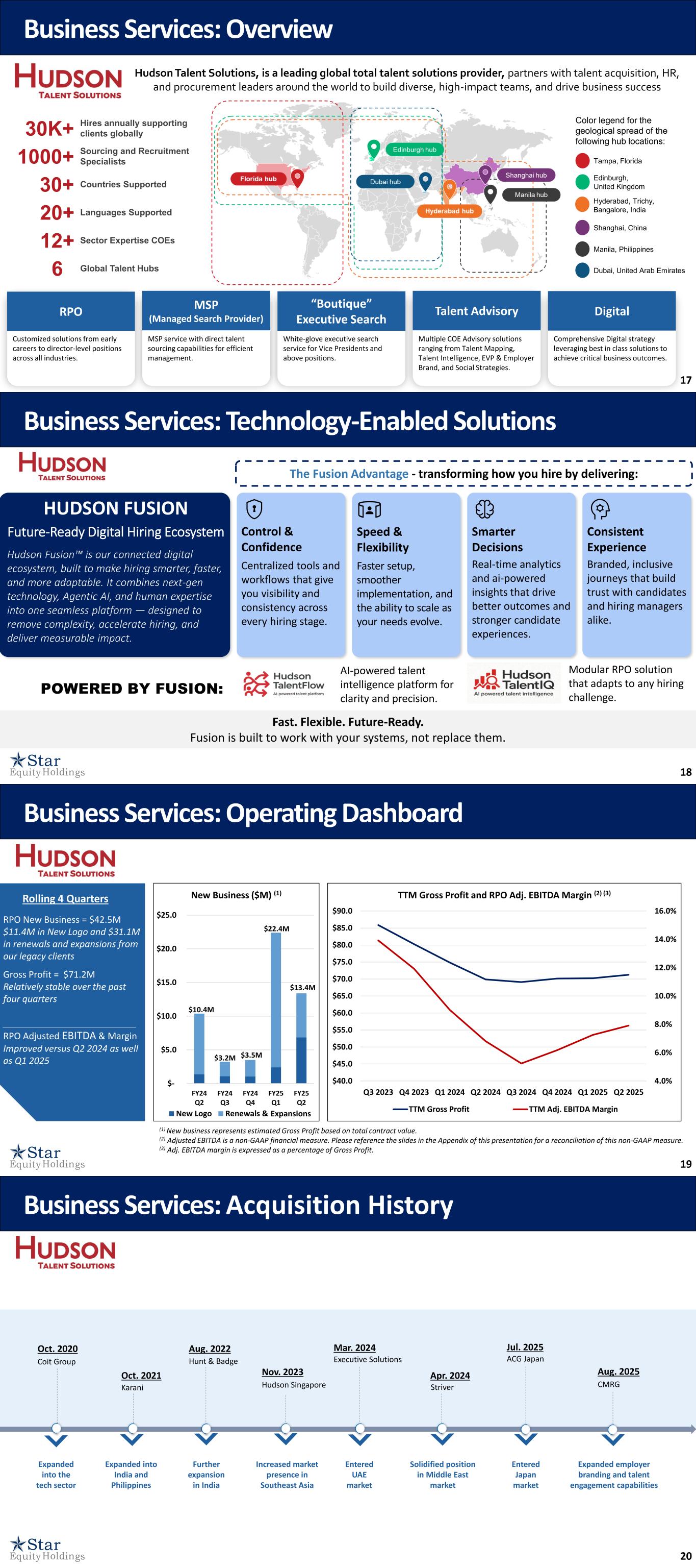 17 MSP服务以直接的人才寻源能力进行高效管理。副总裁及以上职位白手套猎头服务。多个COE咨询解决方案,包括人才映射、人才情报、EVP &雇主品牌、社交策略。全面的数字化战略利用一流的解决方案来实现关键的业务成果。Hudson Talent Solutions,是一家全球领先的整体人才解决方案提供商,与世界各地的人才获取、人力资源、采购领导者合作,以构建多样化、高影响力的团队,并推动业务成功所有行业从早期职业到总监级职位的定制化解决方案。RPO MSP(托管搜索提供商)“精品”猎头人才咨询佛罗里达州坦帕市为以下枢纽地点的地质分布提供色彩传说:英国爱丁堡海得拉巴、特里奇、印度班加罗尔上海、中国马尼拉、菲律宾迪拜、阿拉伯联合酋长国数字1000 +采购和招聘专家20 +语言支持12 +部门专长COEs 6全球人才中心每年30K +雇用支持全球客户30 +国家支持的商业服务:概述18由FUSION提供动力:适应任何招聘挑战的模块化RPO解决方案。AI驱动的人才智能平台,实现清晰度和精准度。Speed & Flexibility更快的设置、更流畅的实施,以及随着您的需求发展而扩展的能力。始终如一的体验品牌化、包容性的旅程,与候选人和招聘经理建立信任。更智能的决策实时分析和AI驱动的洞察力,推动更好的结果和更强的候选人体验。Control & Confidence集中式工具和工作流程,为您提供在每个招聘阶段的可见性和一致性。快。灵活。为未来做好准备。Fusion是为与您的系统一起工作而构建的,而不是取代它们。The Fusion Advantage-transforming how you hire by delivery:HUDSON FUSION Future-Ready Digital Hiring Ecosystem Hudson Fusion是我们的互联数字生态系统,旨在使招聘更智能、更快、更具适应性。它将下一代技术、Agentic AI和人类专业知识结合到一个无缝平台中——旨在消除复杂性、加速招聘并产生可衡量的影响。商业服务:技术支持的解决方案19 RPO新业务= 4250万美元1140万美元的新徽标和3110万美元的旧客户续订和扩展毛利润= 7120万美元在过去四个季度中相对稳定RPO调整后EBITDA和利润率与2024年第二季度以及2025年第一季度滚动4个季度相比有所改善(1)新业务代表基于合同总价值的估计毛利润。(2)调整后EBITDA是一种非公认会计准则财务指标。请参考本演示文稿附录中的幻灯片,了解这一非GAAP衡量标准的对账情况。(3)调整后EBITDA利润率以毛利百分比表示。$-$ 5.0 $ 10.0 $ 15.0 $ 20.0 $ 25.0 FY24 Q2 FY24 Q3 FY24 Q4 FY25 Q1 FY25 Q2新业务($ M)(1)New Logo Renewals & Exensions $ 1040万$ 320万$ 350万$ 2240万$ 1340万pansions 4.0% 6.0% 8.0% 10.0% 12.0% 14.0% 16.0% $ 40.0 $ 45.0 $ 50.0 $ 55.0 $ 60.0 $ 65.0 $ 70.0 $ 75.0 $ 80.0 $ 85.0 $ 90.0 Q3 2023 Q4 2023 Q1 2024 Q2 2024 Q3 2024 Q4 2024 Q4 2024 Q1 2025 Q1 2025 Q2 TTM毛利和RPO Adj. EBITDA Margin(2)(3)TTM毛利率丨TTM Adj. EBITDA Margin商业服务:运营Dashboard 20 ACG Japan Jul. 2025 Coit Group Oct. 2020 Karani Oct. 2021 Hunt & Badge Oug.2022 Hudson Singapore Nov. 2023 Executive Solutions Mar.2024 Striver Apr. 2024 CMRG Aug.2025向科技领域扩展扩展到印度和菲律宾进一步扩展在印度扩大东南亚市场占有率进入阿联酋市场巩固中东市场地位进入日本市场扩大雇主品牌和人才参与能力商业服务:收购历史