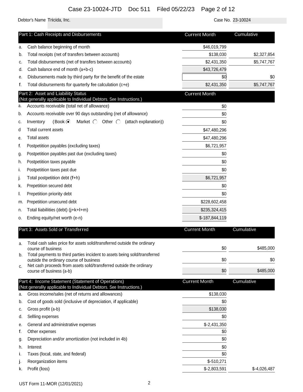 UST表格11-MOR(12/01/2021)12债务人名称Tricida, Inc.案号23-10024页四页三案号23-10024-JTD Doc 511提交05/22/23第12页