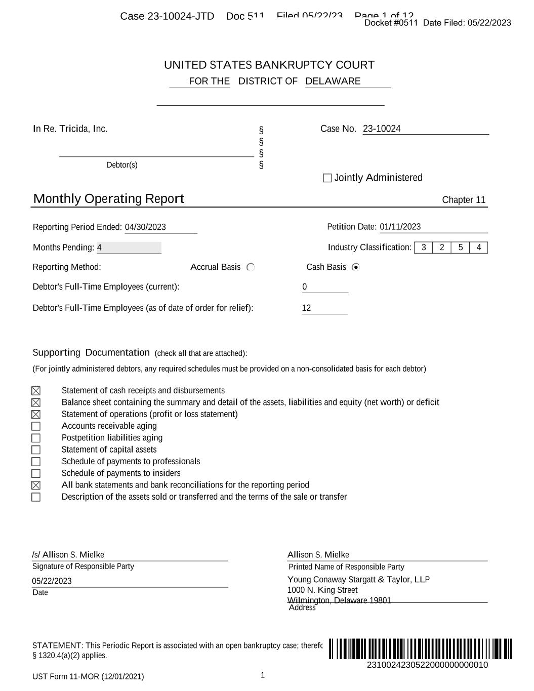 UST表格11-MOR(12/01/2021)1 UNITED STATES BANKRUPTCY COURT DISTRICT OFFOR THE DELAWARE In Re。Tricida, Inc.债务人(s)§ § § § Case No. 23-10024共同管理的月度经营报告第11章报告期截止日期:04/30/2023请愿日期:0 1/11/2023待决月份:4行业分类:3254报告方法:权责发生制现金制债务人的全职雇员(当前):0债务人的全职雇员(截至救济命令发布之日):12证明文件(检查所有随附的):(对于共同管理的债务人,任何必要的附表必须在非合并基础上为每个债务人提供)现金收支表包含资产摘要和详细信息的资产负债表,负债和权益(净值)或赤字经营报表(损益表)应收账款账龄后负债账龄资本资产报表支付给专业人员的款项明细表支付给内部人的款项明细表报告期内所有银行对账单和银行对账报告所述期间出售或转让的资产和出售或转让条件的描述责任方的签名印刷责任方的姓名日期地址/s/Allison S. Mielke 05/22/2023 Allison S. Mielke Young Conaway Stargatt & Taylor,LLP 1000 N. King Street Wilmington,特拉华州19801声明:本定期报告与一个未决的破产案件有关;因此,适用《减少文书工作法》豁免5 C.F.R. § 1320.4(a)(2)。判例23-10024-JTD Doc 511提交05/22/23第1页,共12页