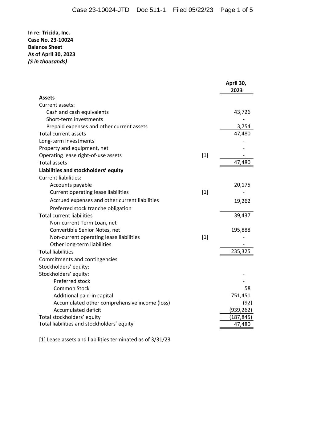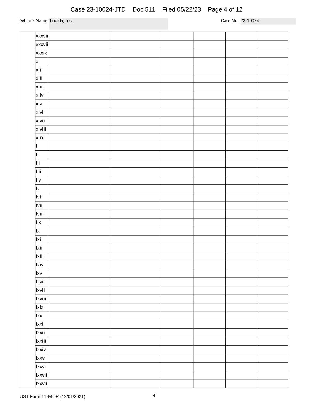 UST表格11-MOR(12/01/2021)4债务人名称Tricida, Inc.案件编号23-10024 xxxvii xxxvii xxxxix xl xli xlii xliii xliv xlv xlvi xlvii xlix l li lii liii liiv lv lvi lvii lvii lix lx lxi lxii lxii lxiv lxv lxvi lxvi lxvii lxvii lxxix lxx lxxxi lxxii lxxxii case 23-10024-JTD Doc 511 Filed 05/22/23 Page 4 of 12