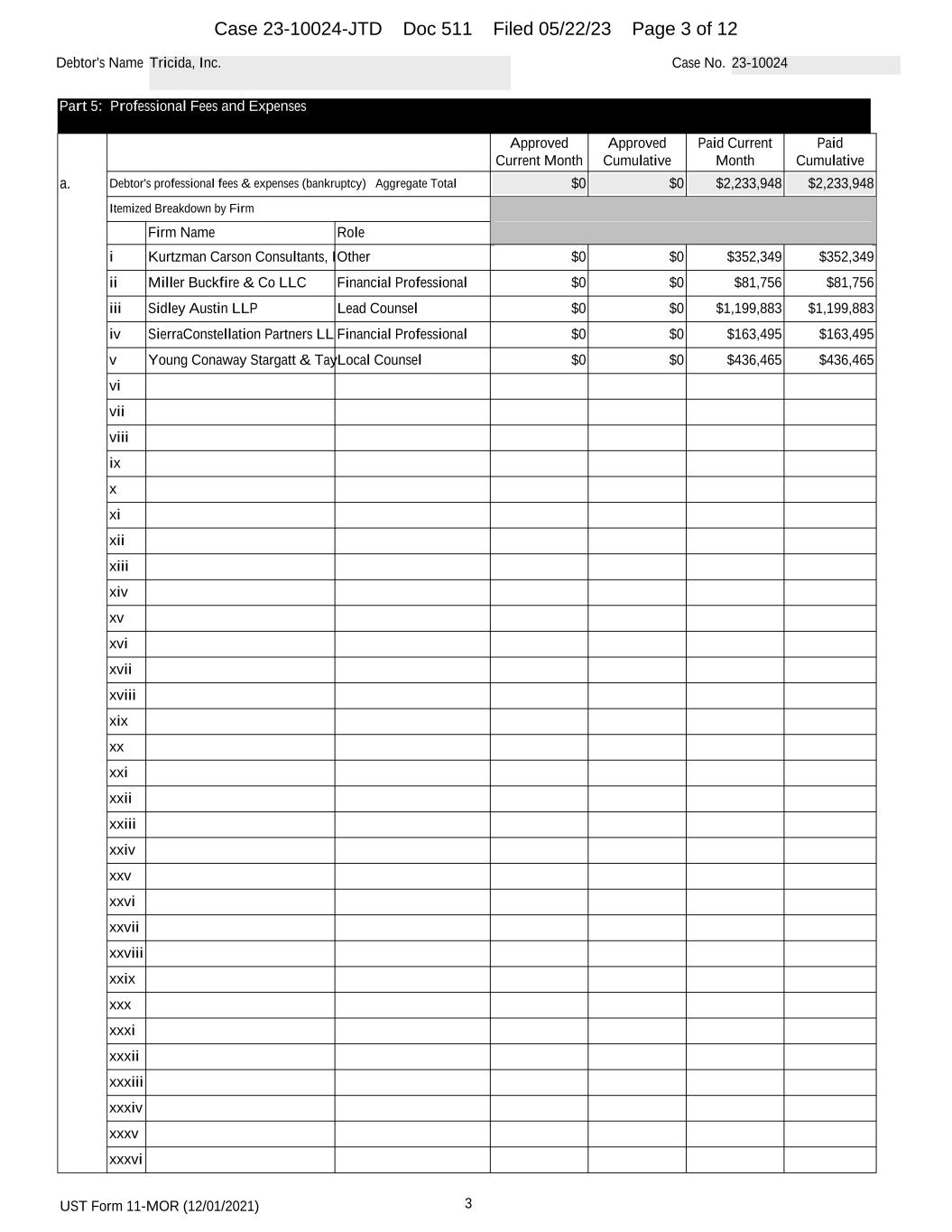 UST表格11-MOR(12/01/2021)3债务人名称Tricida, Inc.案件编号23-10024第5部分:专业费用和开支批准当月批准累计支付当月支付累计a.债务人专业费用和开支(破产)总额0美元0美元2,233,948美元2,233,948美元按公司名称分列的细目Role i Kurtzman Carson Consultants,iOther $ 0 $ 0 $ 352,349 $ 352,349 ii Miller Buckfire & Co LLC Financial Professional $ 0 $ 0 $ 81,756 $ 81,756 iii Sidley Austin LLP Lead Counsel $ 0 $ 0 $ 1,199,883 $ 1,199,883 iv SierraConstellation Partners LL Financial Professional $ 0 $ 0 $ 163,495 $ 163,495 v Young Conaway Stargatt & TayLocal Counsel $ 0 $ 0 $ 436,465 $ 436,465 vi vii viii ix x xi xii xii xii xiv xiv xiv xxiv xxv xxvi xxvii xxvii xxvii xxxvii xxxx xx