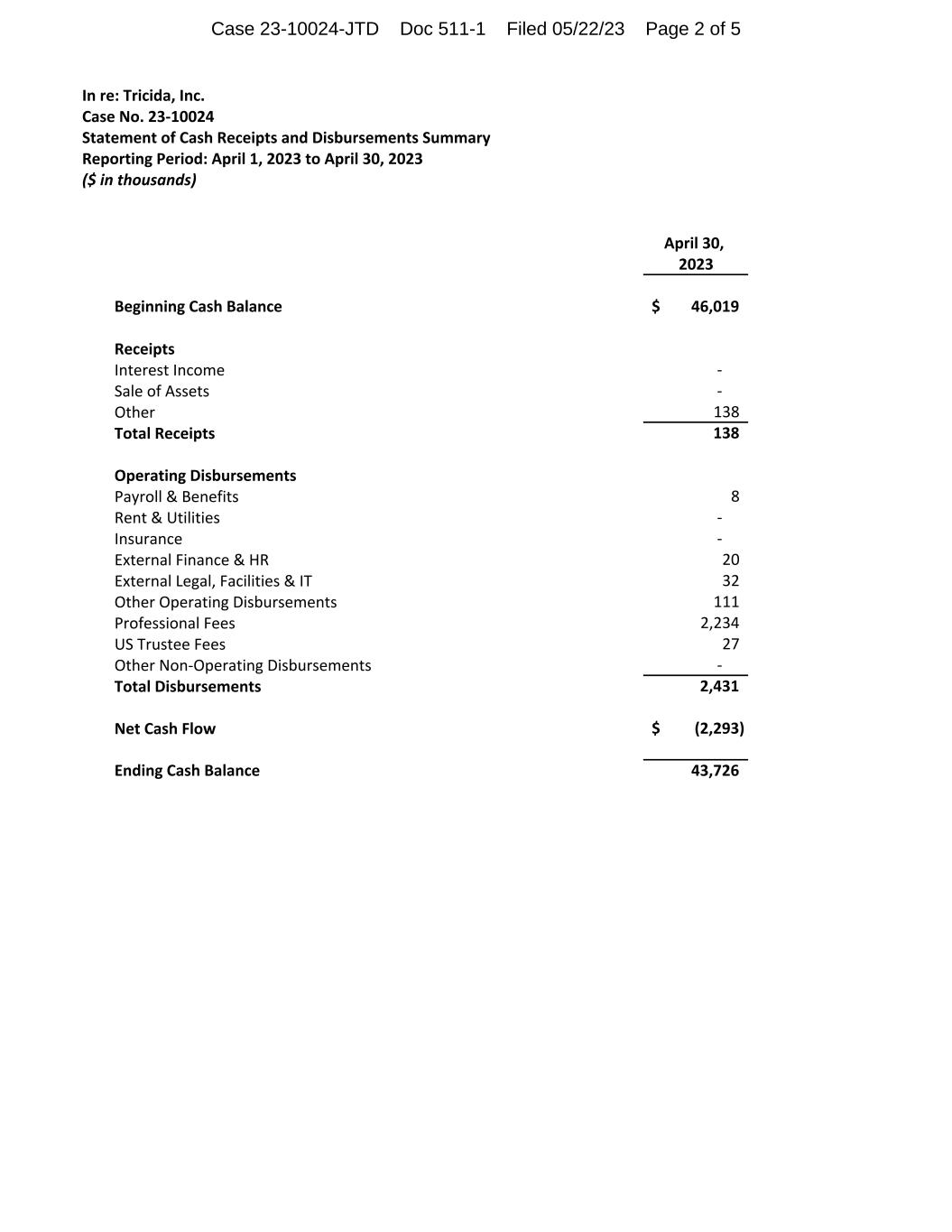 关于:Tricida, Inc.案例编号23-10024现金收支报表摘要报告期:2023年4月1日至2023年4月30日(单位:千美元)2023年4月30日期初现金余额46019美元收据利息收入-出售资产-其他138总收据138营业支出工资和福利8租金和公用事业-保险-外部财务和人力资源20外部法律,设施与IT 32其他运营支出111专业费用2,234美国受托人费用27其他非运营支出-总支出2,431净现金流(2,293)$期末现金余额43,726案例23-10024-JTD Doc 511-1提交05/22/23第2页,共5页