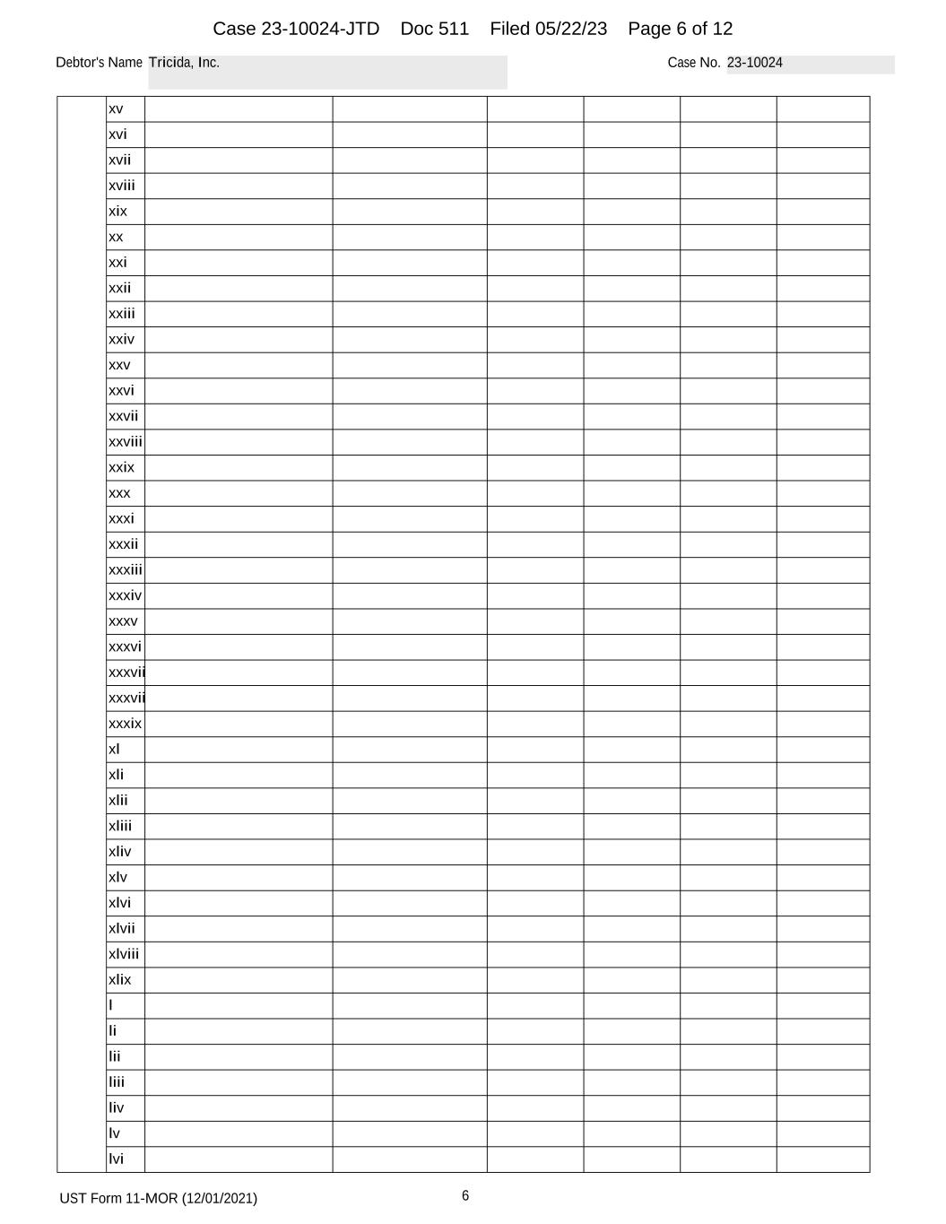 UST表格11-MOR(12/01/2021)6债务人名称Tricida, Inc.案件编号23-10024 xv xvi xvii xvii xix xxi xxi xxii xxii xxiv xxv xxvi xxvii xxvii xxvix xxx xxxi xxxxii xxxxiv xxv xxv xxvi xxxvi xxxvi xxxvii xxxvii xxxxxix xl xli xliii xliv xlv xlvi xlvi xlvii xlvii xlix l li lii liii liv lvi Case 23-10024-JTD Doc 511 Filed 05/22/23 Page 6 of 12