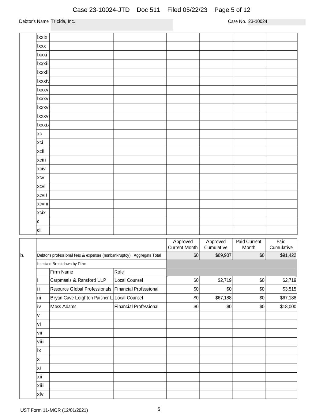 UST表格11-MOR(12/01/2021)5债务人姓名Tricida,Inc. Case No. 23-10024 lxxix lxxx lxxxi lxxxii lxxxii lxxxiv lxxxv lxxxvi lxxxvi lxxxvi lxxxxxix xc xci xcii xciii xciv xcv xcv xcvi xcvi xcvii xcvii xcix c ci Approved Current Month Approved Cumulative Paid Current Month Paid Cumulative b.债务人的专业费用和开支(非破产)总计$ 0 $ 69,907 $ 0 $ 91,422 Itemized Breakdown by Firm Name Role i Carpmaels & Ransford LLP Localvi vii viii ix x xi xii xiii xiv案23-10024-JTD Doc 511提交05/22/23第5页,共12页