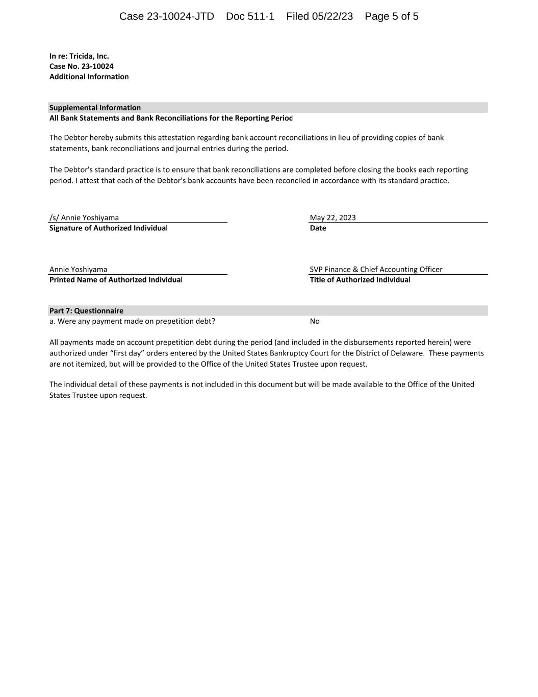 关于:Tricida, Inc.案例第23-10024号附加信息补充信息报告期内所有银行对账单和银行对账单/s/Annie Yoshiyama 2023年5月22日授权个人签名日期Annie Yoshiyama财务高级副总裁兼首席财务官打印授权个人名称第7部分:调查表a.是否支付了申请前债务?债务人特此提交有关银行账户对账的证明,而不是提供银行对账单、银行对账和该期间的日记账分录的副本。债务人的标准做法是确保在每个报告期结账之前完成银行对账。我证明,债务人的每一个银行账户都是按照其标准做法进行核对的。在此期间,就申请前债务支付的所有款项(包括在本文报告的付款中)都是根据美国破产法院为特拉华州地区下达的“第一天”命令授权支付的。这些付款没有逐项列出,但应要求将提供给美国受托人办公室。这些付款的具体细节未列入本文件,但应要求将提供给美国受托人办公室。判例23-10024-JTD Doc 511-1提交05/22/23第5页