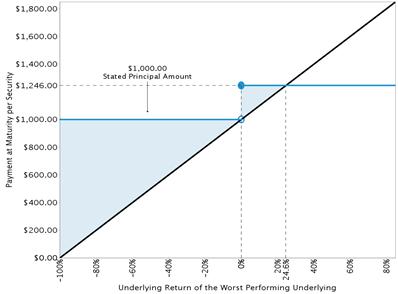 | ▪ | 在该估值日表现最差的标的的收盘价大于或等于其初始标的价值的第一个估值日(最终估值日除外)之后,该证券提供了以溢价自动提前赎回的可能性。如果证券未在到期前自动赎回,证券将规定(i)偿还规定的本金金额加如果在最终估值日表现最差的标的的最终标的价值大于或等于其初始标的价值,则到期时溢价或(ii)到期偿还规定的本金金额,没有溢价,如果在最终估值日表现最差的标的的最终标的价值低于其初始标的价值。 |