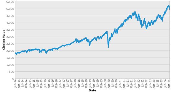 下图显示的是标普 500指数的收盘价®2014年1月2日至2024年4月22日期间,每天都有此类数值的索引。我们从Bloomberg L.P.获得了收盘数值,未经独立验证。你不应该把历史收盘数值作为未来表现的指标。