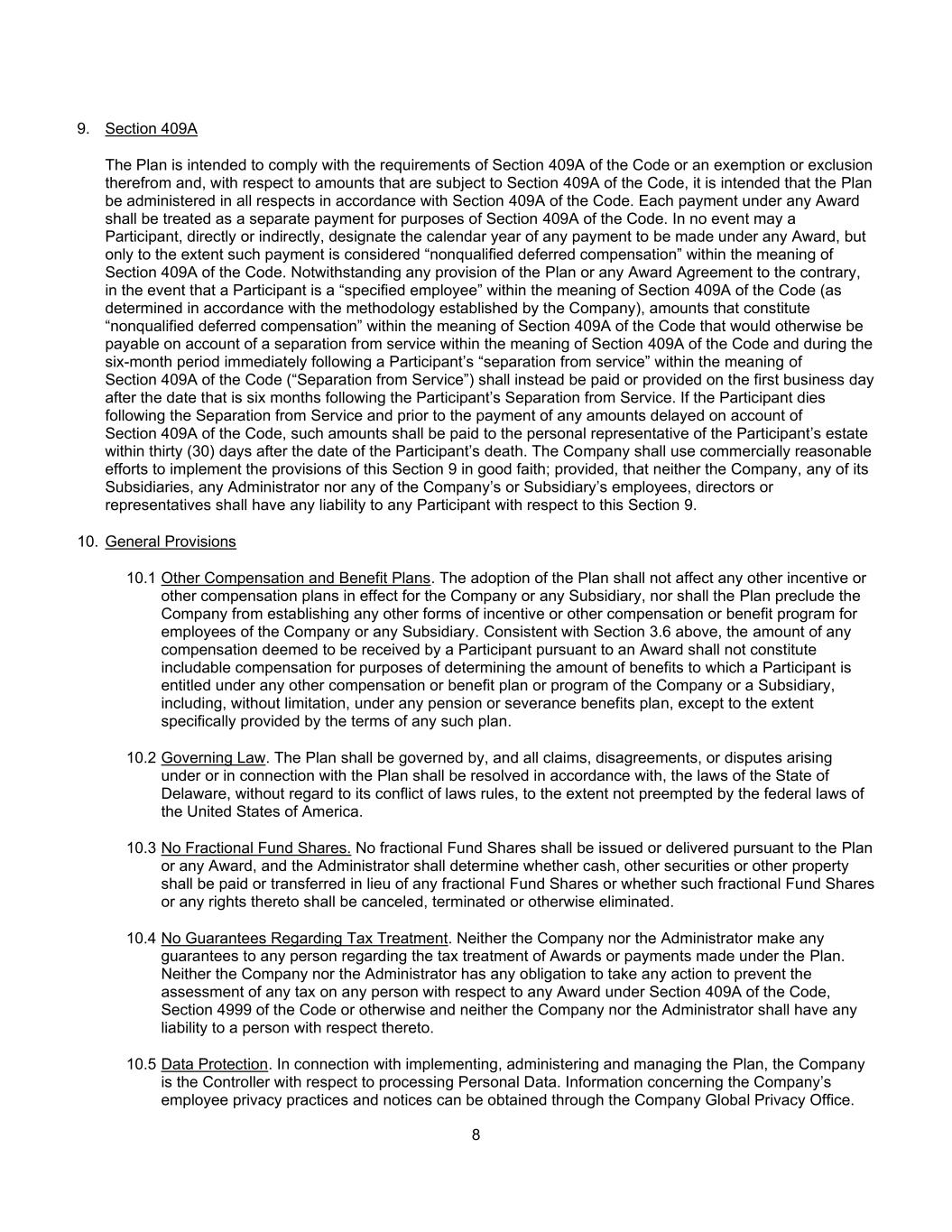 8 9.第409A条该计划旨在遵守《守则》第409A条的要求或豁免或排除,就受《守则》第409A条约束的金额而言,该计划拟在所有方面按照《守则》第409A条进行管理。就《守则》第409A条而言,任何裁决项下的每笔付款均须视为单独付款。在任何情况下,参与者不得直接或间接指定根据任何裁决支付的任何款项的日历年度,但仅限于此类付款被视为《守则》第409A条含义内的“不合格递延补偿”的范围内。尽管计划或任何授标协议有任何相反的规定,如果参与者是《守则》第409A条(根据公司制定的方法确定)所指的“特定雇员”,构成《守则》第409A条含义内的“不合格递延补偿”的金额,否则将因《守则》第409A条含义内的离职和紧接于《守则》第409A条含义内的参与者“离职”(“离职”)后的六个月期间内应支付或提供的金额,应改为在参与者离职后六个月之日后的第一个工作日支付或提供。如果参与者在离职后和因《守则》第409A条而延迟支付任何款项之前死亡,则应在参与者死亡之日后三十(30)天内将这些款项支付给参与者遗产的遗产代理人。公司须作出商业上合理的努力,以诚意执行本条第9条的规定;但公司、其任何附属公司、任何管理人或公司或附属公司的任何雇员、董事或代表均不得就本条对任何参与者承担任何法律责任。10.总则10.1其他补偿和福利计划。该计划的采纳不影响对公司或任何附属公司有效的任何其他激励或其他薪酬计划,亦不妨碍公司为公司或任何附属公司的雇员设立任何其他形式的激励或其他薪酬或福利计划。根据上文第3.6节,参与者根据裁决被视为收到的任何补偿的金额,在确定参与者根据公司或子公司的任何其他补偿或福利计划或计划(包括但不限于根据任何养老金或离职福利计划)有权获得的福利金额时,不应构成包括在内的补偿,但任何此类计划的条款具体规定的范围除外。10.2管辖法律。该计划应受美国联邦法律管辖,根据该计划或与该计划有关的所有索赔、分歧或争议应根据特拉华州法律解决,而不考虑其冲突法律规则,但范围不应被美利坚合众国联邦法律优先考虑。10.3无零碎基金份额。不得依据计划或任何奖励发行或交付零碎基金份额,管理人应确定是否应支付或转让现金、其他证券或其他财产以代替任何零碎基金份额,或该等零碎基金份额或其任何权利是否应被注销、终止或以其他方式消除。10.4没有关于税务处理的保证。公司和管理人均未就根据该计划作出的奖励或付款的税务处理向任何人作出任何保证。公司或管理人均无义务采取任何行动,以阻止就根据《守则》第409A条、《守则》第4999节或其他条款作出的任何裁决对任何人征收任何税款,公司或管理人均无义务就此对任何人承担任何法律责任。10.5数据保护。在实施、管理和管理该计划方面,公司是处理个人数据方面的控制人。有关公司员工隐私惯例和通知的信息可通过公司全球隐私办公室获得。