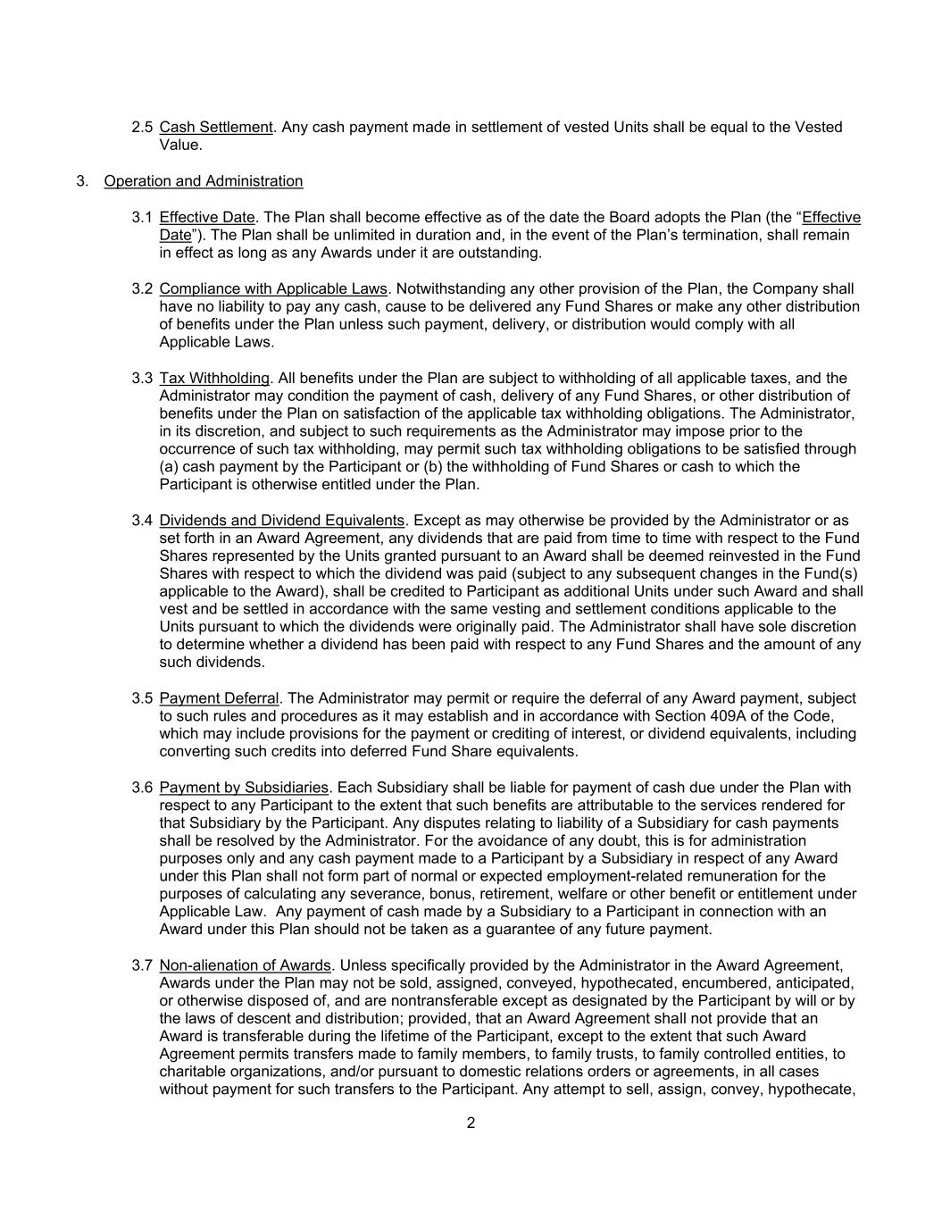 22.5现金结算。为结算归属单位而支付的任何现金,应等于归属价值。3.运营管理3.1生效日期。该计划应自董事会通过该计划之日(“生效日期”)起生效。该计划的期限应是无限的,并且在计划终止的情况下,只要该计划下的任何奖励尚未兑现,该计划将继续有效。3.2遵守适用法律。尽管本计划另有任何规定,公司并无责任根据本计划支付任何现金、安排交付任何基金份额或作出任何其他利益分配,除非该等支付、交付或分配将符合所有适用法律。3.3预扣税款。该计划下的所有福利均需预扣所有适用税款,管理人可将支付现金、交付任何基金份额或该计划下的其他福利分配以履行适用的预扣税款义务为条件。管理人可酌情并在符合管理人在发生此种预扣税款之前可能施加的要求的情况下,允许通过(a)参与者支付现金或(b)预扣参与者根据本计划有权获得的基金份额或现金来履行此种预扣税款义务。3.4股息和股息等价物。除署长另有规定或授标协议另有规定外,就依据授标授予的单位所代表的基金份额而不时支付的任何股息,须当作再投资于就其支付股息的基金份额(但须视乎适用于授标的基金的任何后续变动而定),应作为该奖励下的额外单位记入参与者名下,并应根据适用于最初支付股息所依据的单位的相同归属和结算条件归属和结算。管理人应全权酌情决定是否已就任何基金份额支付股息以及任何此类股息的金额。3.5延期付款。管理人可允许或要求推迟任何奖励付款,但须遵守其可能建立的规则和程序并根据《守则》第409A条,其中可能包括利息或股息等价物的支付或贷记的规定,包括将此类贷记转换为递延基金份额等价物。3.6子公司付款。各附属公司均有责任就任何参与者支付根据该计划到期的现金,但该等利益可归因于参与者为该附属公司提供的服务。与子公司现金支付责任有关的任何争议,由管理人解决。为免生任何疑问,这仅用于管理目的,而附属公司就本计划下的任何奖励向参与者支付的任何现金,不得构成为计算适用法律规定的任何遣散费、奖金、退休金、福利或其他福利或应享权利而进行的正常或预期雇佣相关薪酬的一部分。子公司就本计划下的奖励向参与者支付的任何现金不应被视为任何未来付款的保证。3.7裁决的不异化。除非管理人在授标协议中作出具体规定,否则计划下的授标不得出售、转让、转让、质押、设押、预期或以其他方式处置,且不可转让,除非参与者根据遗嘱或世系和分配法律指定;但授标协议不得规定授标在参与者的整个存续期内可转让,除非该授标协议允许向家庭成员、家庭信托、家庭控制实体、慈善组织和/或根据家庭关系命令或协议进行转让,在所有情况下,都不向参与者支付此类转账的费用。任何出售、转让、转让、质押的企图,