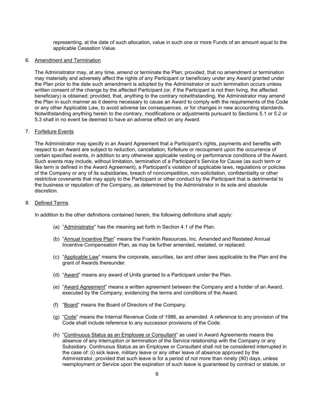6表示在此种分配之日,在此种一种或多种基金中的价值,其数额等于适用的停止价值。6.修订及终止管理人可随时修订或终止该计划;但任何修订或终止不得对任何参与者或受益人在管理人采纳该等修订或发生该等终止的日期之前根据该计划所授出的任何奖励下的权利产生重大不利影响,除非获得受影响参与者(或,如果该参与者当时不在世,则为受影响的受益人)的更改书面同意;但条件是,尽管有任何相反的情况,管理人可按其认为必要的方式修订计划,以使裁决符合守则或任何其他适用法律的要求,以避免不利的税务后果,或新会计准则的变更。尽管本文另有相反规定,依据第5.1或5.2或5.3条作出的修改或调整,在任何情况下均不得当作对任何裁决有不利影响。7.没收事件管理人可在授标协议中指明,除任何其他适用的授予或履行条件外,参与者就某项授标的权利、付款和利益在发生某些特定事件时须予减少、取消、没收或补偿。此类事件可能包括但不限于因故终止参与者的服务(此类术语或类似术语在授予协议中定义)、参与者违反公司或其任何子公司的适用法律、法规或政策、违反可能适用于参与者的不竞争、不招揽、保密或其他限制性契诺或参与者的其他损害公司业务或声誉的行为,由管理人全权酌情决定。8.定义的术语除此处包含的其他定义外,还应适用以下定义:“管理员”具有计划第4.1节中规定的含义。“年度激励计划”是指经修订和重述的、可能进一步修订、重述或替换的富兰克林资源公司年度激励薪酬计划。“适用法律”指适用于该计划的公司、证券、税务和其他法律以及根据该计划授予的奖励。“奖励”是指根据该计划授予参与者的任何单位的奖励。“奖励协议”指公司与奖励持有人之间的书面协议,由公司签署,以证明奖励的条款和条件。“董事会”是指公司的董事会。“法典”是指经修订的1986年《国内税收法典》。对《守则》任何条文的提述,应包括对《守则》任何后续条文的提述。授标协议中使用的“作为雇员或顾问的持续身份”是指与公司或任何子公司的服务关系不存在任何中断或终止。在以下情况下,不应将雇员或顾问的连续身份视为中断:(i)病假、军假或署长批准的任何其他休假,但此种休假的期限不超过九十(90)天,除非合同或法规保证在此种休假期满时再就业或服务,或