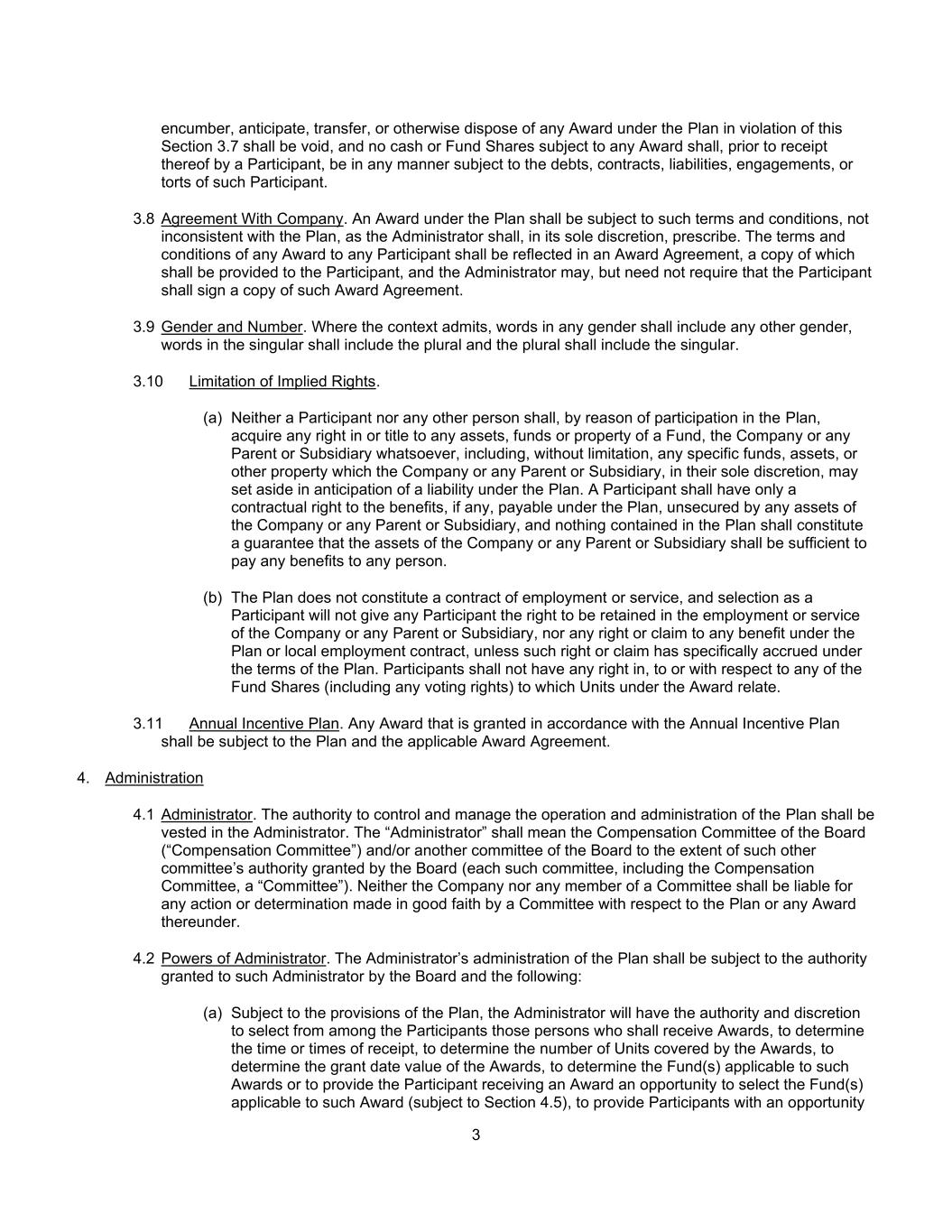 3违反本第3.7节对计划下的任何授标作保、预期、转让或以其他方式处置,均为无效,且任何受任何授标约束的现金或基金份额在参与者收到之前,均不得以任何方式受该参与者的债务、合同、责任、约定或侵权行为的约束。3.8与公司的协议。计划下的授标须受署长全权酌情订明的条款及条件所规限,不得与计划相抵触。授予任何参与者的任何奖励的条款和条件应反映在奖励协议中,该协议的副本应提供给参与者,而管理人可以但不必要求参与者签署该奖励协议的副本。3.9性别和人数。在语境允许的情况下,任何性别的词语应包括任何其他性别,单数的词语应包括复数,复数应包括单数。3.10隐含权利的限制。(a)任何参与者或任何其他人均不得因参与计划而取得基金、公司或任何母公司或附属公司的任何资产、资金或财产的任何权利或所有权,包括但不限于公司或任何母公司或附属公司在预期计划下的负债时可全权酌情撤销的任何特定资金、资产或其他财产。参与者仅享有根据计划应付的、由公司或任何母公司或子公司的任何资产无担保的利益(如有)的合同权利,而计划中所载的任何内容均不得构成公司或任何母公司或子公司的资产足以向任何人支付任何利益的保证。(b)该计划不构成雇佣或服务合同,选择为参与者将不会赋予任何参与者在公司或任何母公司或子公司的雇佣或服务中保留的权利,也不会赋予任何根据该计划或当地雇佣合同获得任何福利的权利或主张,除非该权利或主张已根据该计划的条款具体累积。参与者对奖励下的单位所涉及的任何基金份额(包括任何投票权)不享有任何权利、享有或就其享有任何权利。3.11年度激励计划。根据年度激励计划授予的任何奖励应以该计划和适用的奖励协议为准。4.行政4.1管理员。控制和管理计划的运行和管理的权力归属于管理人。“管理人”是指董事会的薪酬委员会(“薪酬委员会”)和/或董事会的另一个委员会,但以董事会授予的其他委员会的权限为限(每个此类委员会,包括薪酬委员会,“委员会”)。公司或任何委员会成员均无须对委员会就该计划或根据该计划作出的任何裁决善意作出的任何行动或决定承担法律责任。4.2管理人的权力。管理人对计划的管理应受董事会授予该管理人的权力和以下规定的约束:(a)在符合计划规定的情况下,管理人将有权和酌处权从参与者中选择那些应获得奖励的人,以确定收到奖励的时间或时间,确定奖励涵盖的单位数量,以确定奖励的授予日期价值,决定适用于该等奖励的基金或为获得奖励的参与者提供选择适用于该等奖励的基金的机会(受第4.5节规限),为参与者提供机会
